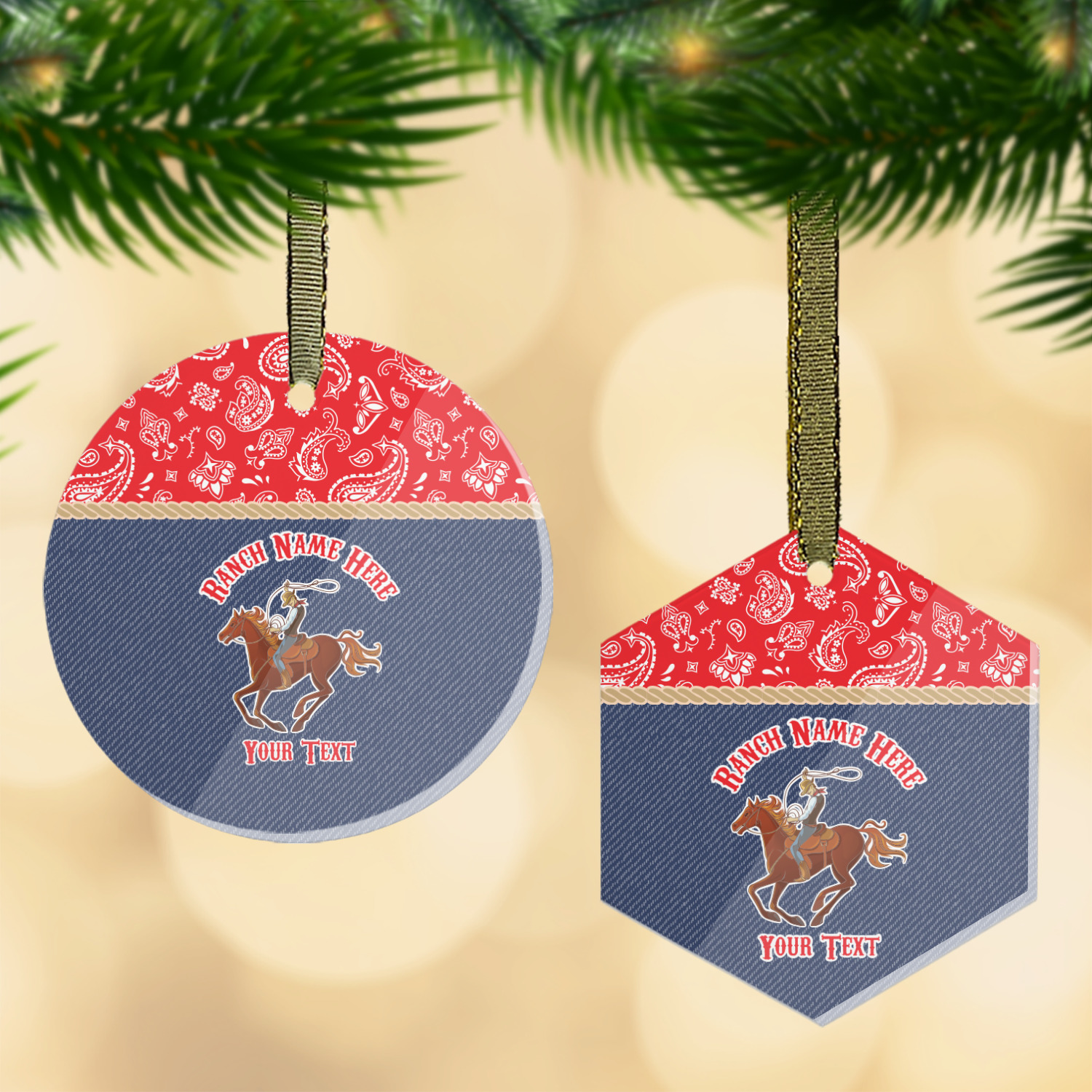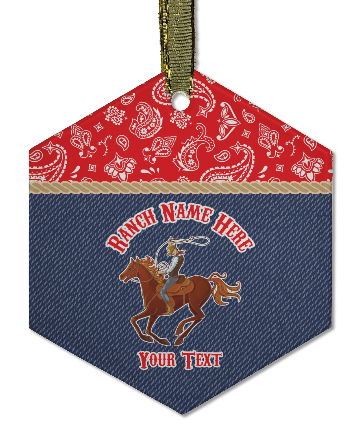 The design has two backgrounds where one fills up two thirds of the background and the other fills up the remaining third. The top third is a bright red paisley design that will get you smiling. The bottom two thirds is a denim pattern that feels like home. A rope ribbon divides the two backgrounds. On the bottom part is a roping cowboy graphic with your personalization above and below him.