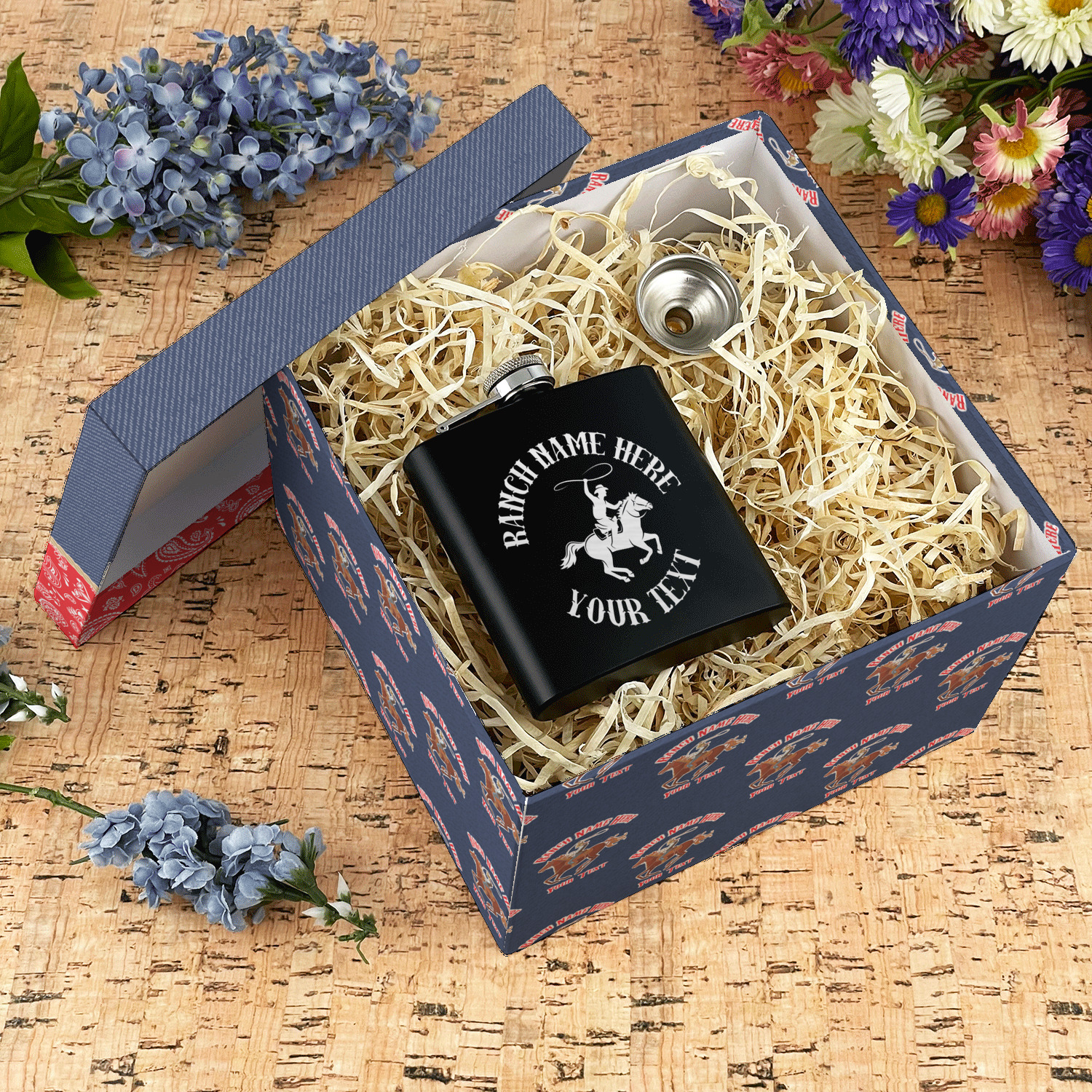 The design has two backgrounds where one fills up two thirds of the background and the other fills up the remaining third. The top third is a bright red paisley design that will get you smiling. The bottom two thirds is a denim pattern that feels like home. A rope ribbon divides the two backgrounds. On the bottom part is a roping cowboy graphic with your personalization above and below him.