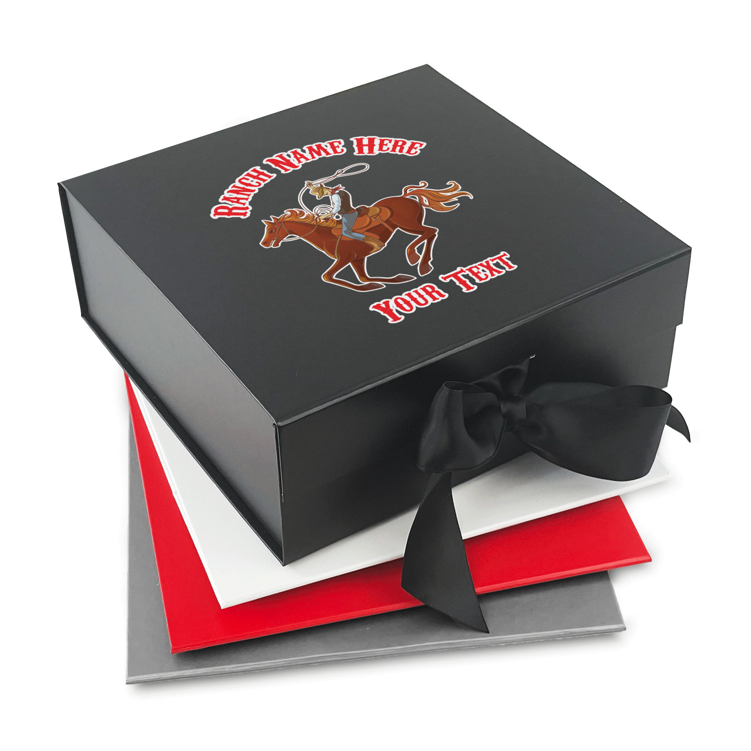 Design your own using our design library and we will print your artwork onto the lid of the gift box. When the box is closed the ribbons can be tied to secure the lid and add to the elegant look of these gift boxes.