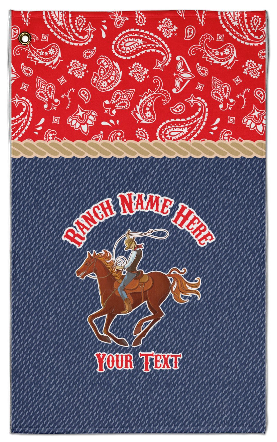 The design has two backgrounds where one fills up two thirds of the background and the other fills up the remaining third. The top third is a bright red paisley design that will get you smiling. The bottom two thirds is a denim pattern that feels like home. A rope ribbon divides the two backgrounds. On the bottom part is a roping cowboy graphic with your personalization above and below him.