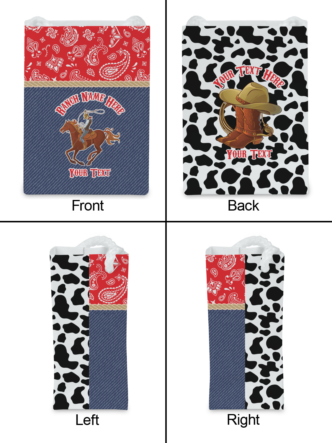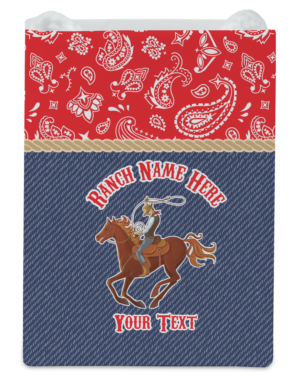The design has two backgrounds where one fills up two thirds of the background and the other fills up the remaining third. The top third is a bright red paisley design that will get you smiling. The bottom two thirds is a denim pattern that feels like home. A rope ribbon divides the two backgrounds. On the bottom part is a roping cowboy graphic with your personalization above and below him.