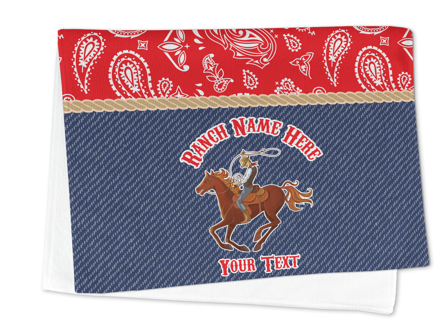 The design has two backgrounds where one fills up two thirds of the background and the other fills up the remaining third. The top third is a bright red paisley design that will get you smiling. The bottom two thirds is a denim pattern that feels like home. A rope ribbon divides the two backgrounds. On the bottom part is a roping cowboy graphic with your personalization above and below him.