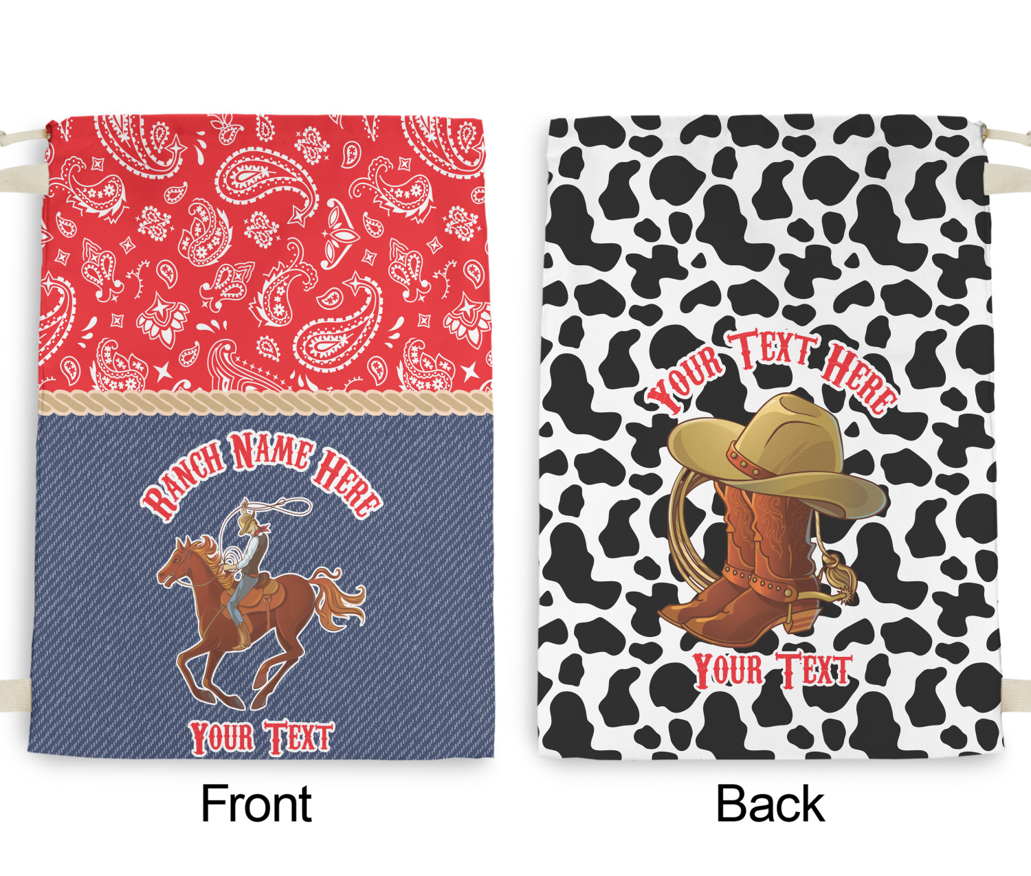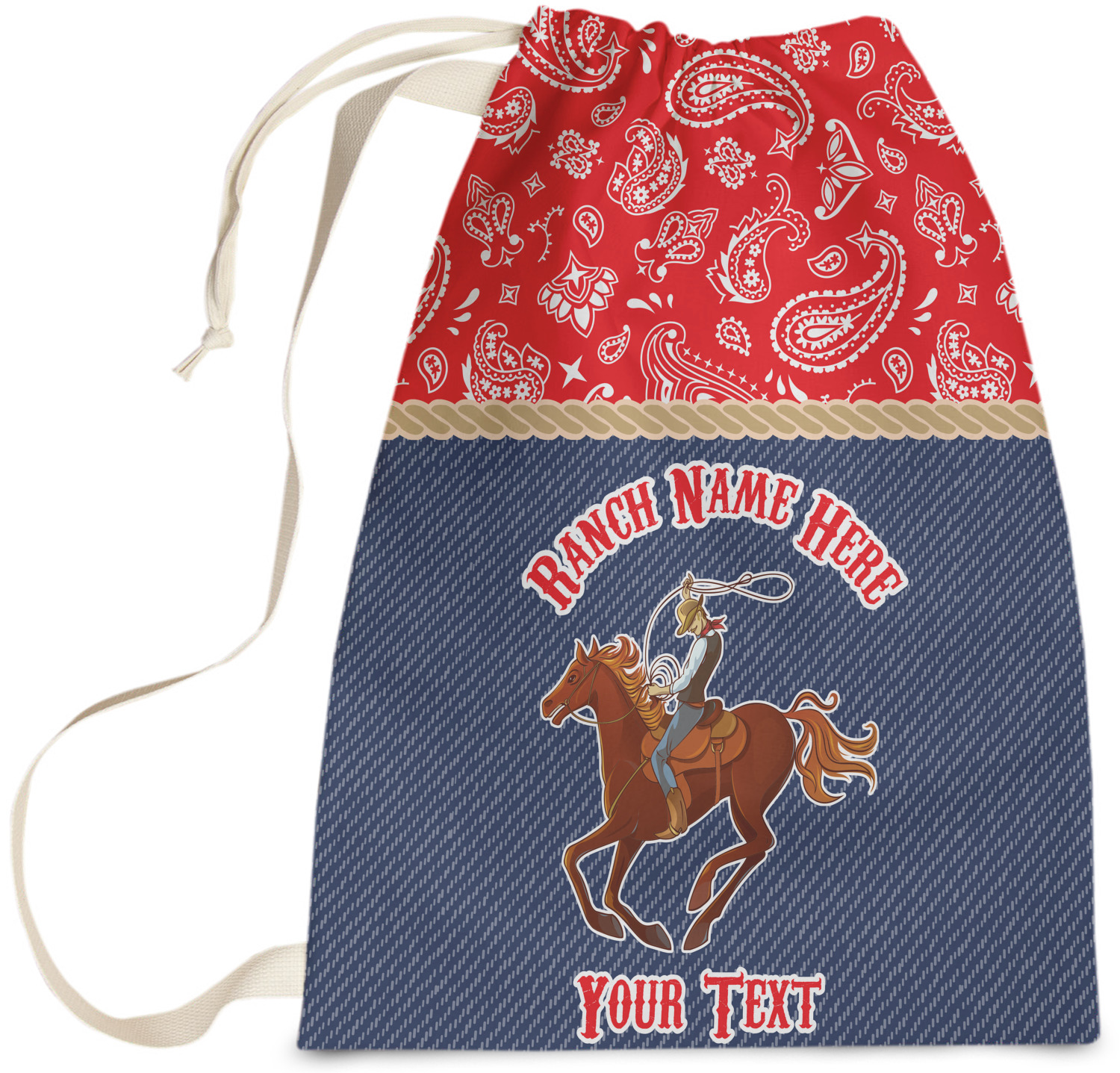 The design has two backgrounds where one fills up two thirds of the background and the other fills up the remaining third. The top third is a bright red paisley design that will get you smiling. The bottom two thirds is a denim pattern that feels like home. A rope ribbon divides the two backgrounds. On the bottom part is a roping cowboy graphic with your personalization above and below him.