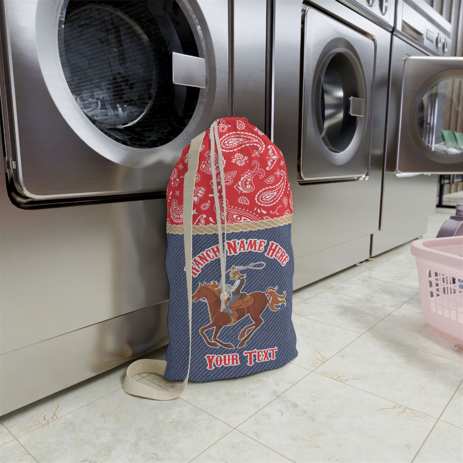 The design has two backgrounds where one fills up two thirds of the background and the other fills up the remaining third. The top third is a bright red paisley design that will get you smiling. The bottom two thirds is a denim pattern that feels like home. A rope ribbon divides the two backgrounds. On the bottom part is a roping cowboy graphic with your personalization above and below him.