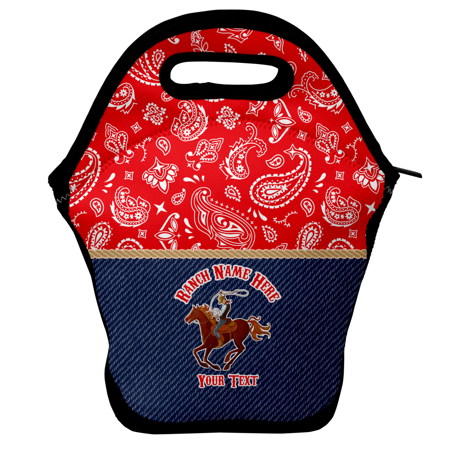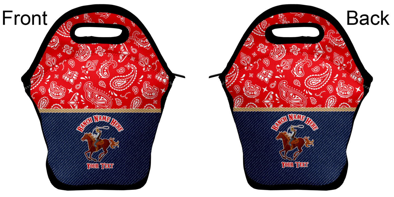 Our personalized lunch bags are made from a strong neoprene, and secure with a zipper closure that lines the top of the bag.The edges of the neoprene are sewn together with a heavy duty stitch, adding to the durability of the bag. The is accompanied by a reinforced handle at its top, for the easy transport of your lunch. We display your personalization across both the front and back of this neoprene lunch bag, while the remaining sides are a sleek black in color. Each bag measures at 13.5 inches tall, and 11.5 inches wide.