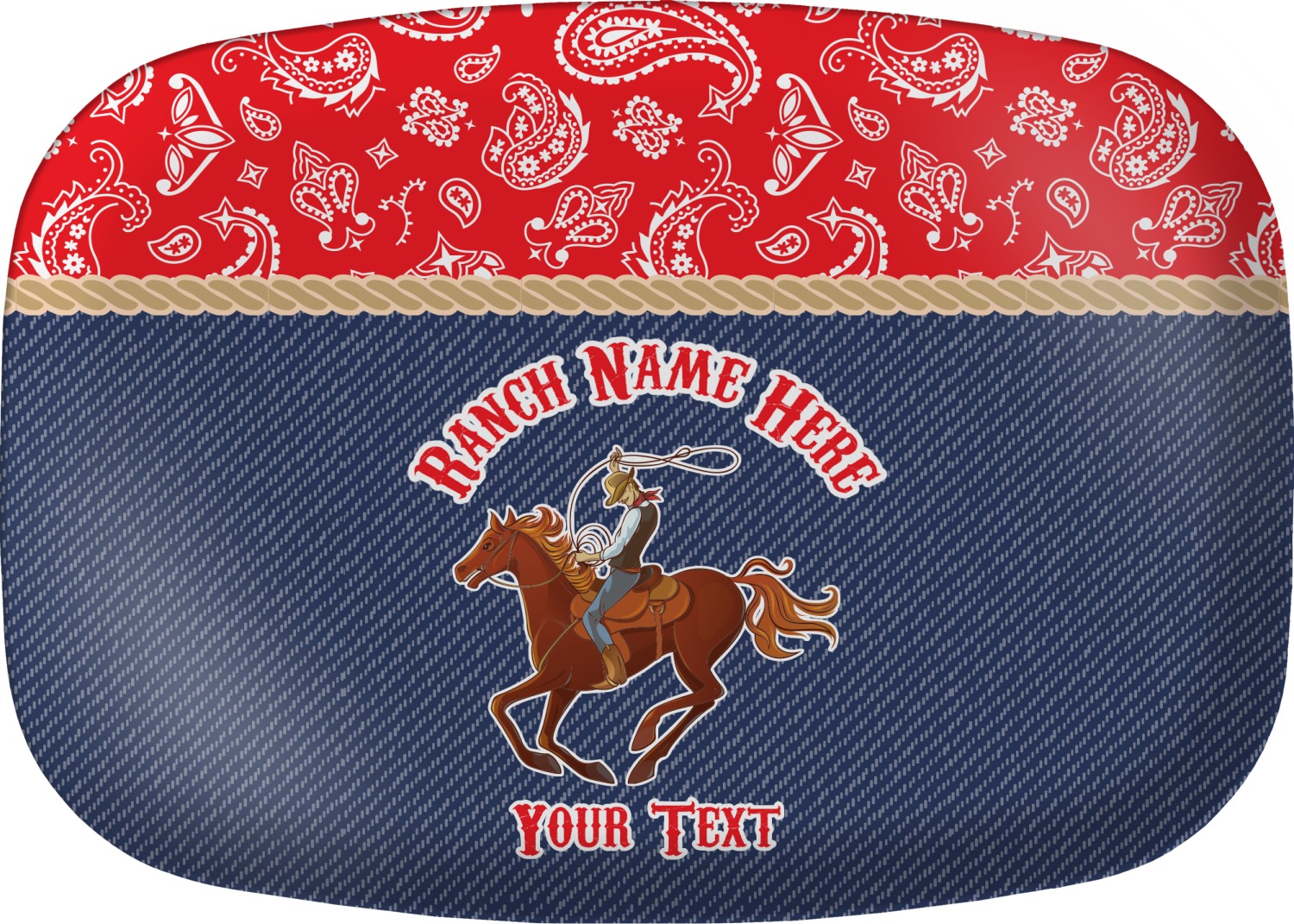The design has two backgrounds where one fills up two thirds of the background and the other fills up the remaining third. The top third is a bright red paisley design that will get you smiling. The bottom two thirds is a denim pattern that feels like home. A rope ribbon divides the two backgrounds. On the bottom part is a roping cowboy graphic with your personalization above and below him.