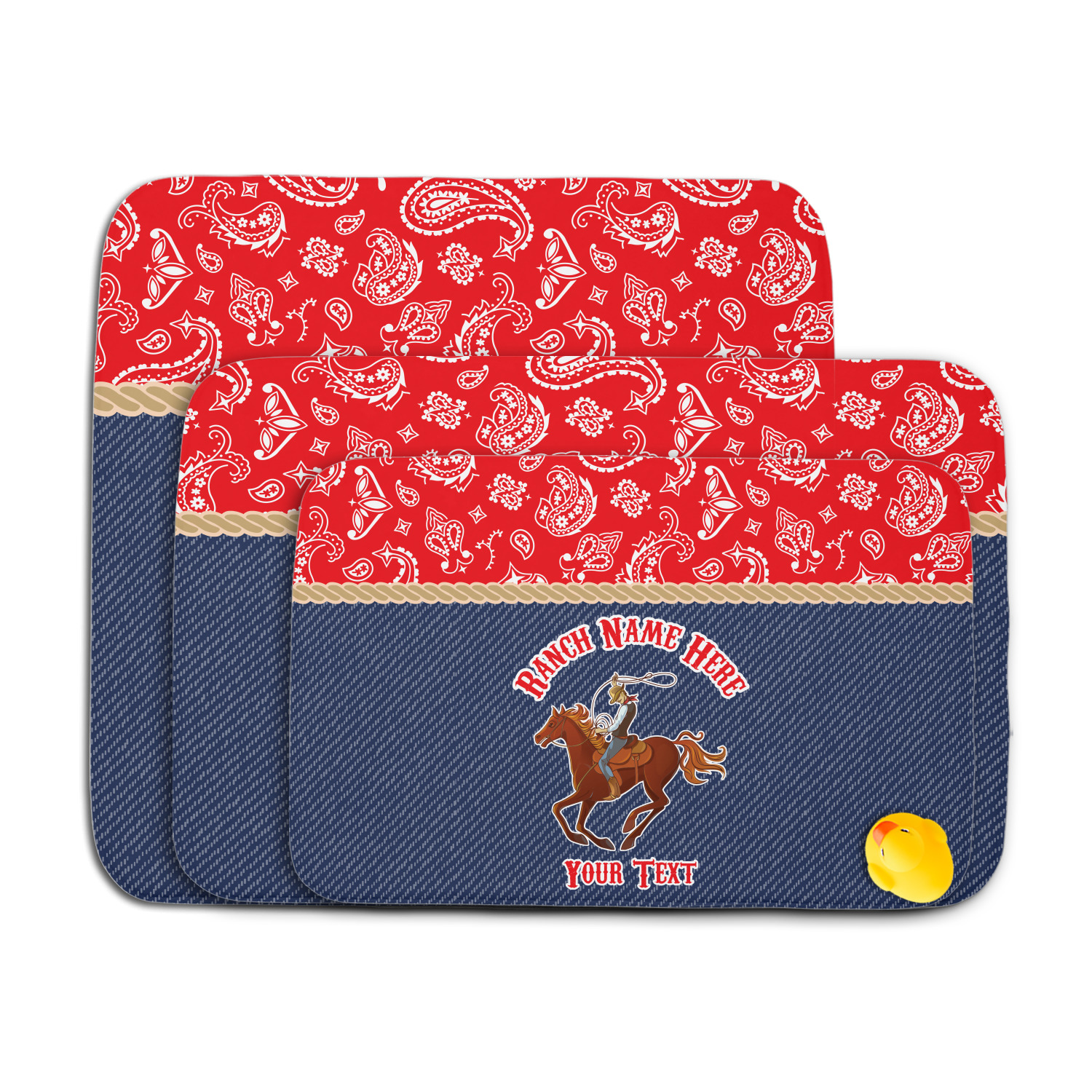 The design has two backgrounds where one fills up two thirds of the background and the other fills up the remaining third. The top third is a bright red paisley design that will get you smiling. The bottom two thirds is a denim pattern that feels like home. A rope ribbon divides the two backgrounds. On the bottom part is a roping cowboy graphic with your personalization above and below him.