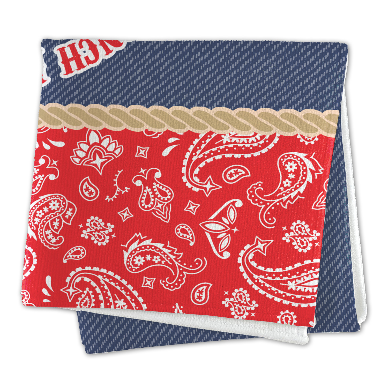 The design has two backgrounds where one fills up two thirds of the background and the other fills up the remaining third. The top third is a bright red paisley design that will get you smiling. The bottom two thirds is a denim pattern that feels like home. A rope ribbon divides the two backgrounds. On the bottom part is a roping cowboy graphic with your personalization above and below him.