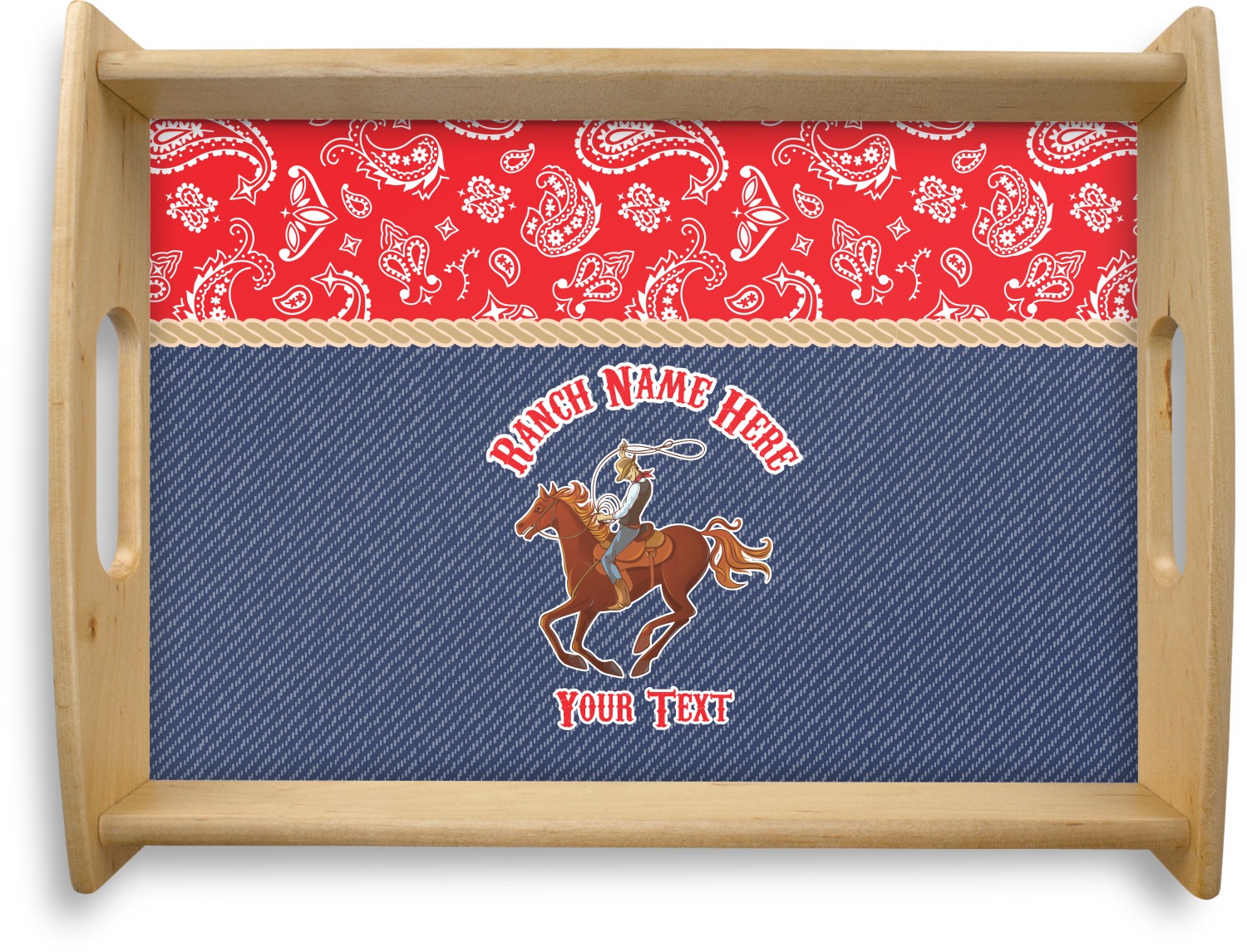 The design has two backgrounds where one fills up two thirds of the background and the other fills up the remaining third. The top third is a bright red paisley design that will get you smiling. The bottom two thirds is a denim pattern that feels like home. A rope ribbon divides the two backgrounds. On the bottom part is a roping cowboy graphic with your personalization above and below him.