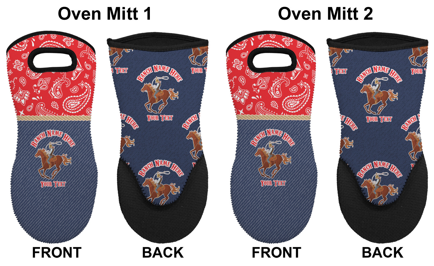 These heat resistant gloves are made entirely of a durable neoprene; the front features a softer texture, while the palm's side has a textured surface, meant to handle heat up to 500 degrees Fahrenheit. Thick, heavy duty stitching connects the two sides. A small, oval cutout appears on the front, and can be used to hang and store the mitt. Your personalization appears on the front, and the upper part of the back of the mitt. The style of these oven mitts are suitable for both the right and left hand, depending on your needs. If you need one for each hand, be sure to order two!