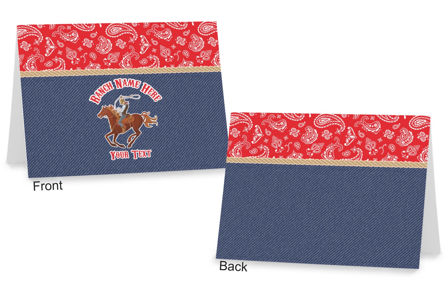 The design has two backgrounds where one fills up two thirds of the background and the other fills up the remaining third. The top third is a bright red paisley design that will get you smiling. The bottom two thirds is a denim pattern that feels like home. A rope ribbon divides the two backgrounds. On the bottom part is a roping cowboy graphic with your personalization above and below him.