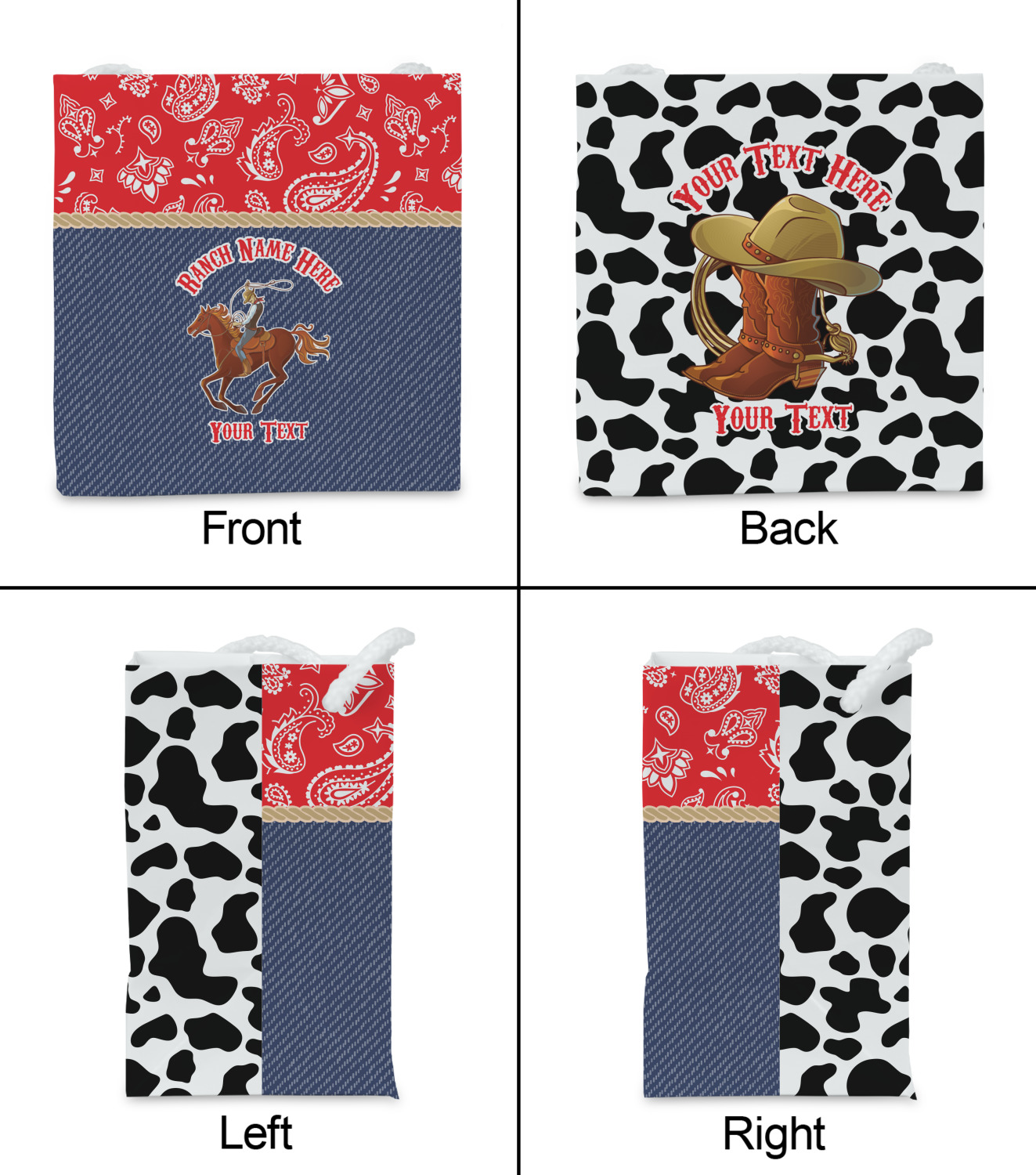 The design has two backgrounds where one fills up two thirds of the background and the other fills up the remaining third. The top third is a bright red paisley design that will get you smiling. The bottom two thirds is a denim pattern that feels like home. A rope ribbon divides the two backgrounds. On the bottom part is a roping cowboy graphic with your personalization above and below him.