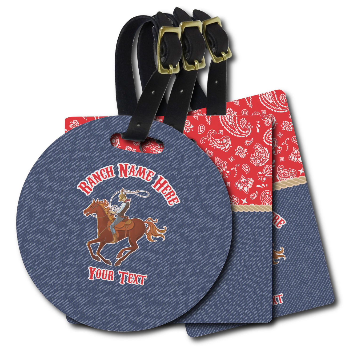 These personalized bag tags are sold in a variety of shapes, so that you may find the product that meets your vision exactly. We sell a round luggage tag, which measures at approximately 4" x 4". Our square luggage tag is about 3.5" x 3.5", while our rectangular version is 2.75" x 4 ".