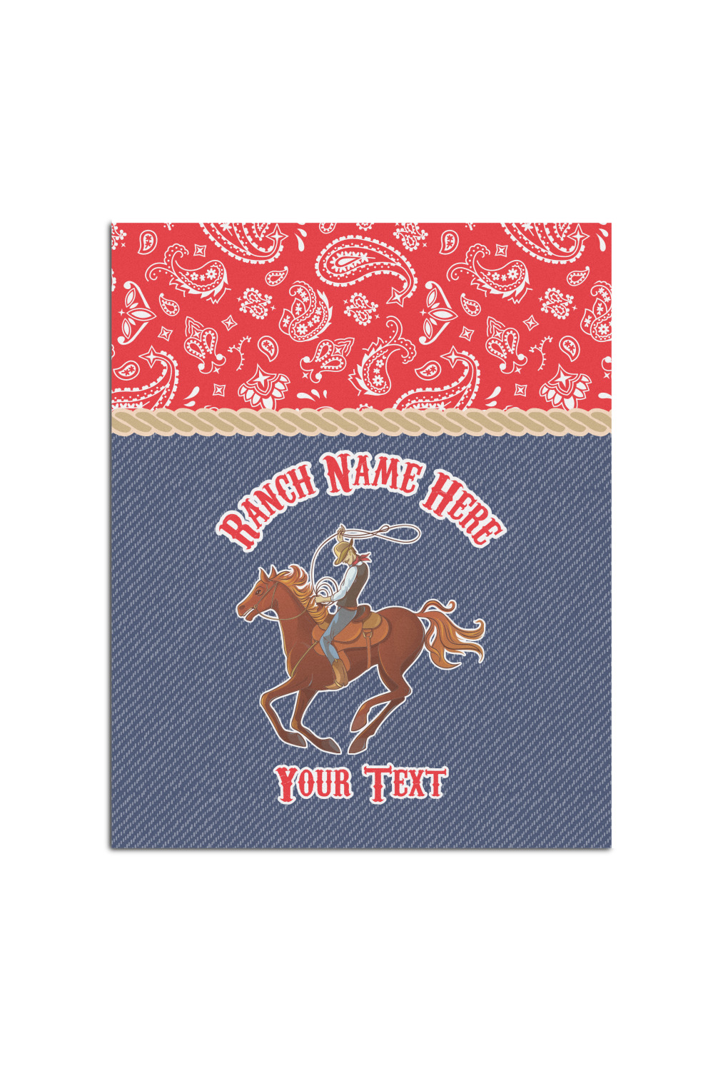 The design has two backgrounds where one fills up two thirds of the background and the other fills up the remaining third. The top third is a bright red paisley design that will get you smiling. The bottom two thirds is a denim pattern that feels like home. A rope ribbon divides the two backgrounds. On the bottom part is a roping cowboy graphic with your personalization above and below him.