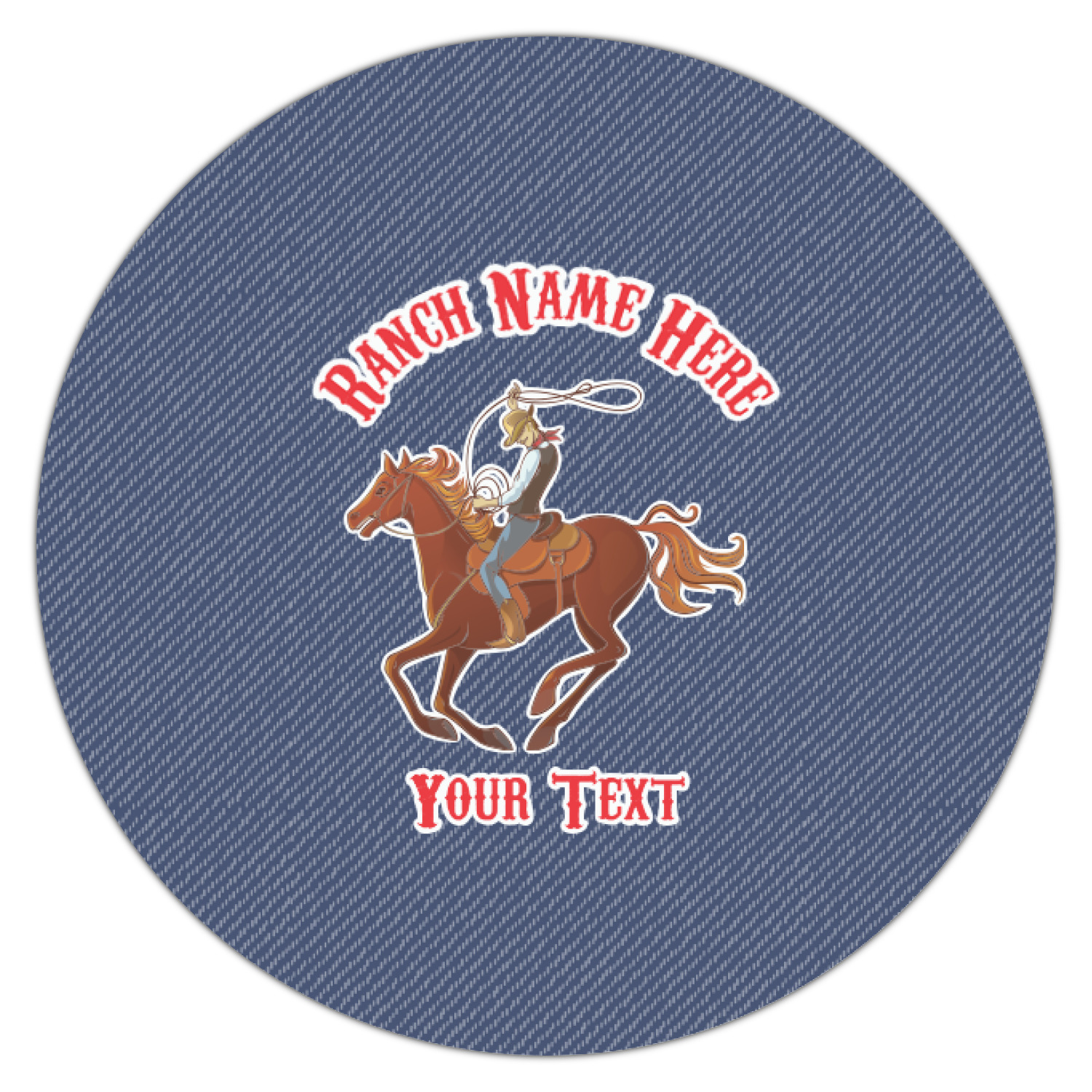 The design has two backgrounds where one fills up two thirds of the background and the other fills up the remaining third. The top third is a bright red paisley design that will get you smiling. The bottom two thirds is a denim pattern that feels like home. A rope ribbon divides the two backgrounds. On the bottom part is a roping cowboy graphic with your personalization above and below him.