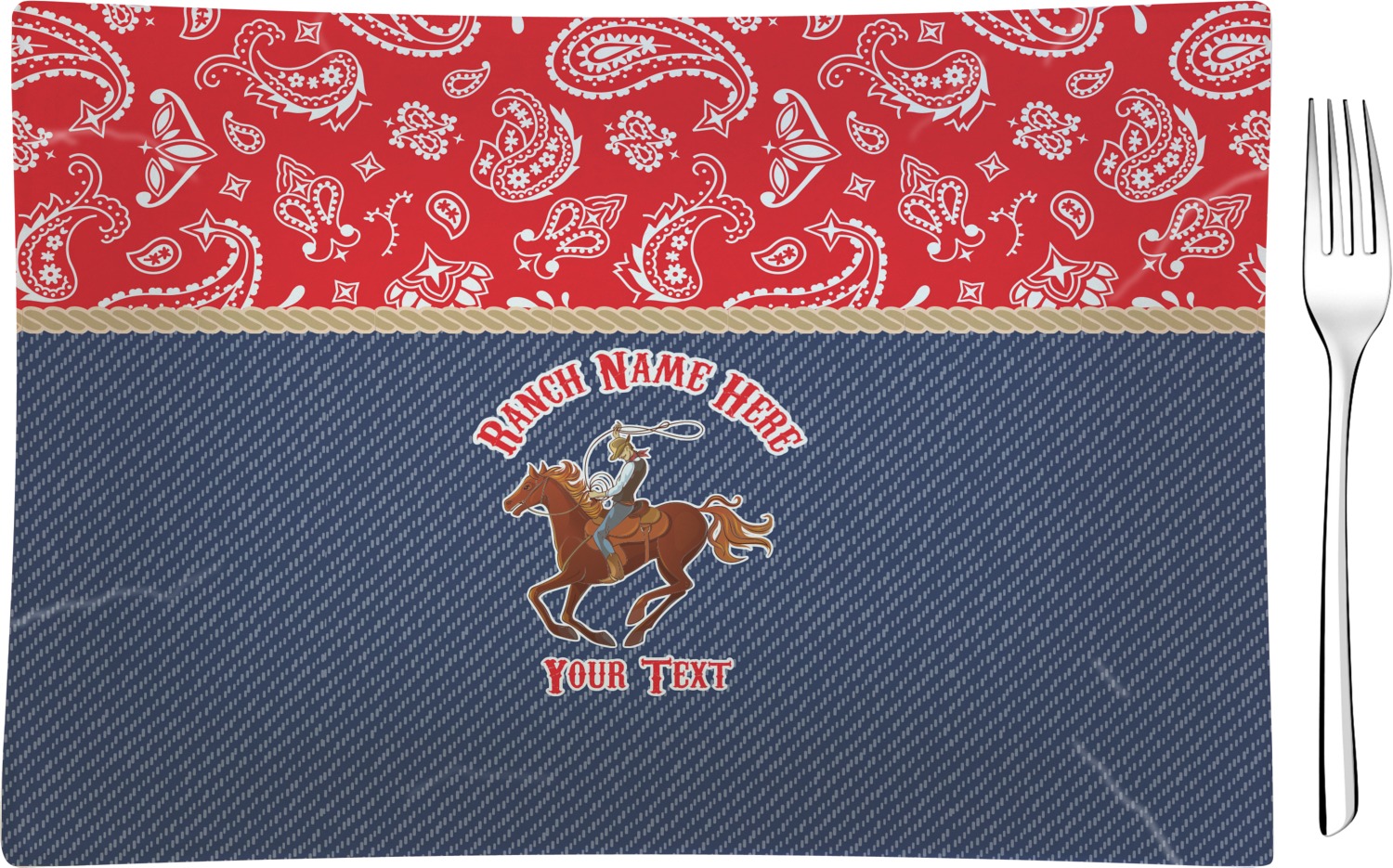 The design has two backgrounds where one fills up two thirds of the background and the other fills up the remaining third. The top third is a bright red paisley design that will get you smiling. The bottom two thirds is a denim pattern that feels like home. A rope ribbon divides the two backgrounds. On the bottom part is a roping cowboy graphic with your personalization above and below him.