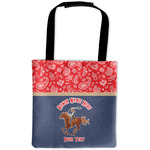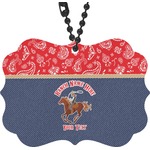 The design has two backgrounds where one fills up two thirds of the background and the other fills up the remaining third. The top third is a bright red paisley design that will get you smiling. The bottom two thirds is a denim pattern that feels like home. A rope ribbon divides the two backgrounds. On the bottom part is a roping cowboy graphic with your personalization above and below him.
