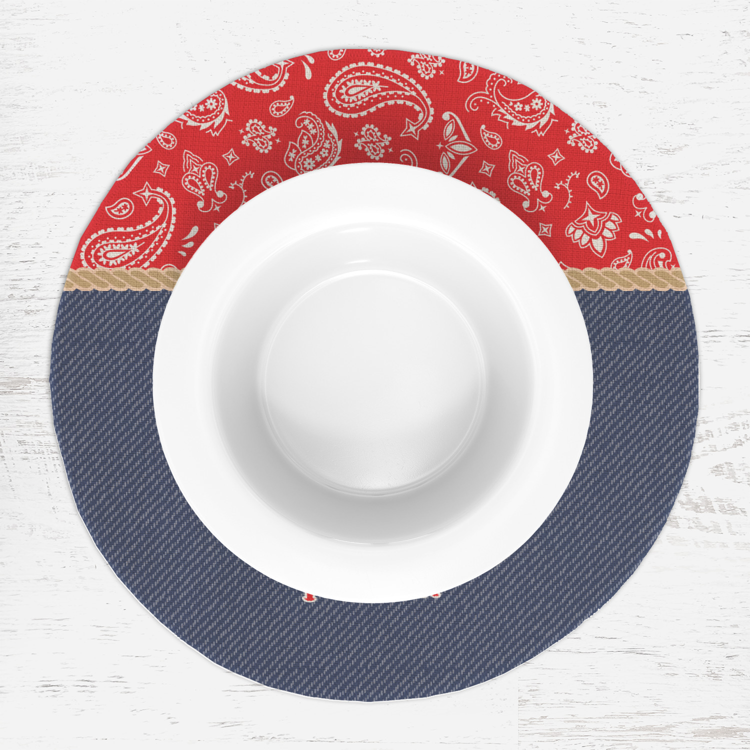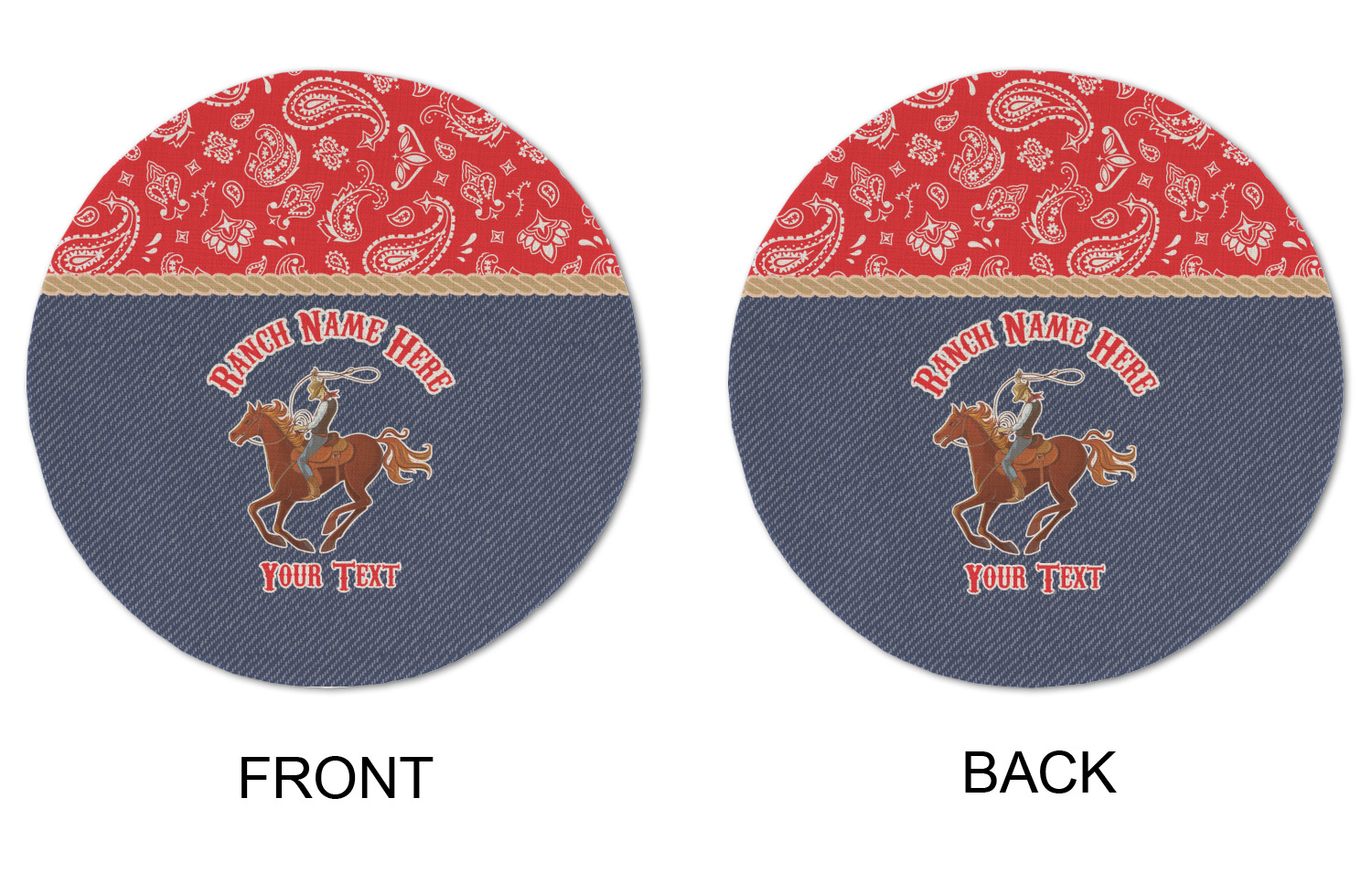 The design has two backgrounds where one fills up two thirds of the background and the other fills up the remaining third. The top third is a bright red paisley design that will get you smiling. The bottom two thirds is a denim pattern that feels like home. A rope ribbon divides the two backgrounds. On the bottom part is a roping cowboy graphic with your personalization above and below him.
