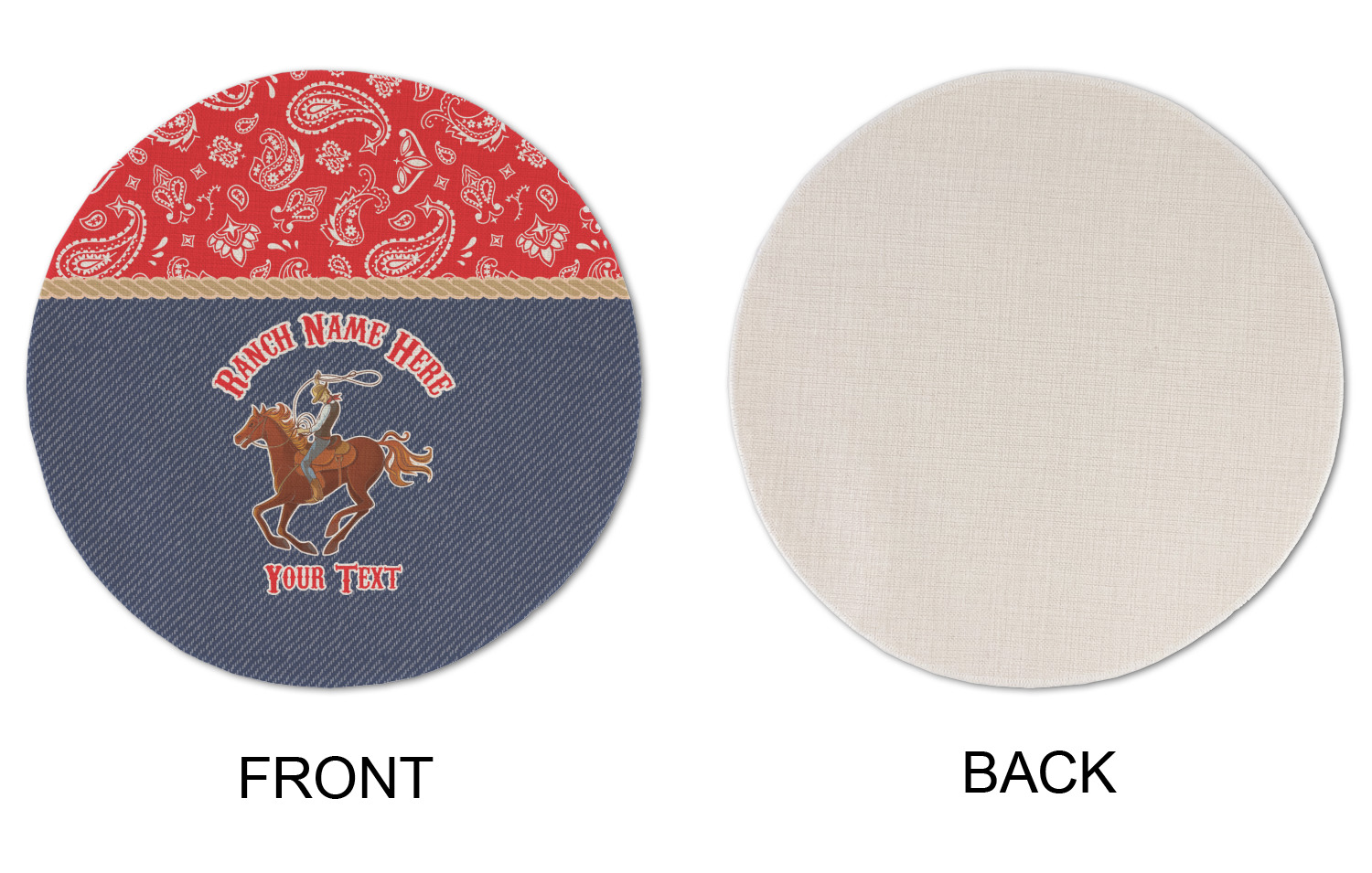 The design has two backgrounds where one fills up two thirds of the background and the other fills up the remaining third. The top third is a bright red paisley design that will get you smiling. The bottom two thirds is a denim pattern that feels like home. A rope ribbon divides the two backgrounds. On the bottom part is a roping cowboy graphic with your personalization above and below him.