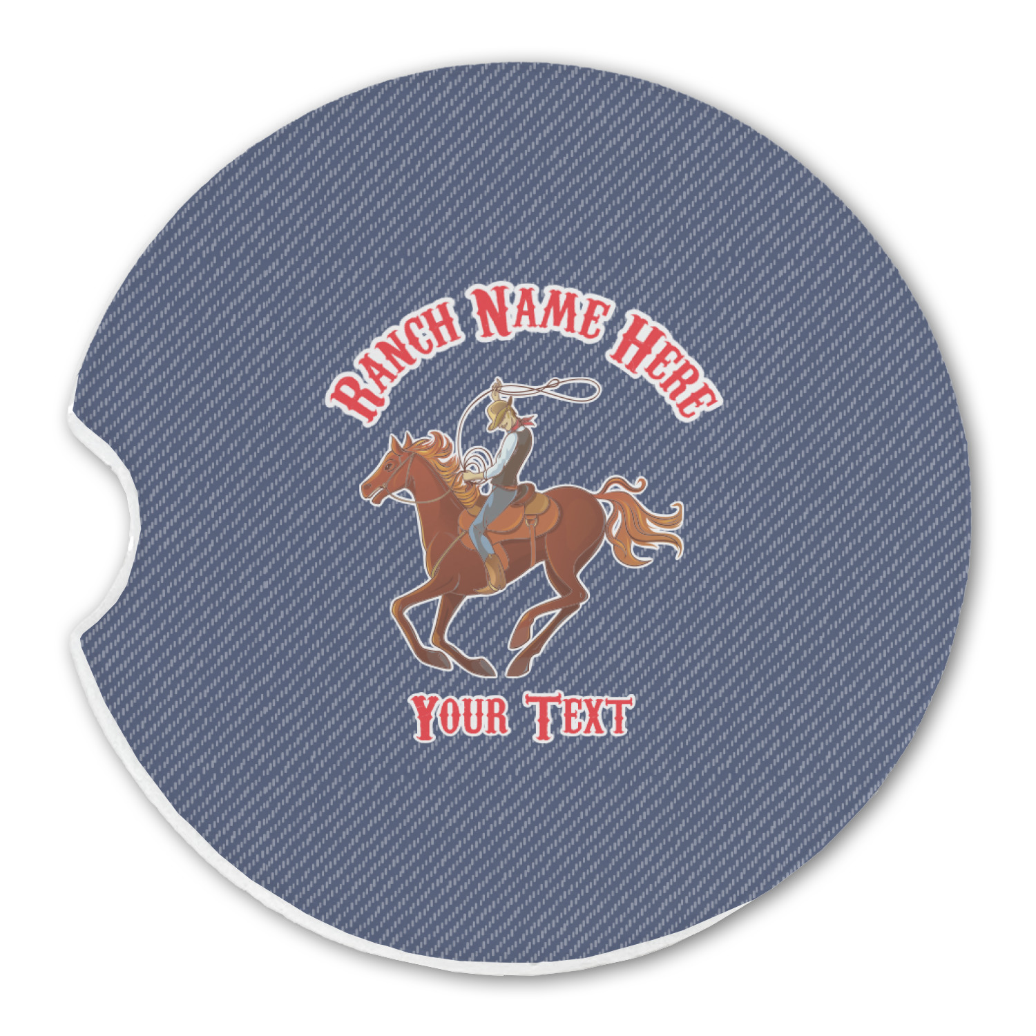 The design has two backgrounds where one fills up two thirds of the background and the other fills up the remaining third. The top third is a bright red paisley design that will get you smiling. The bottom two thirds is a denim pattern that feels like home. A rope ribbon divides the two backgrounds. On the bottom part is a roping cowboy graphic with your personalization above and below him.