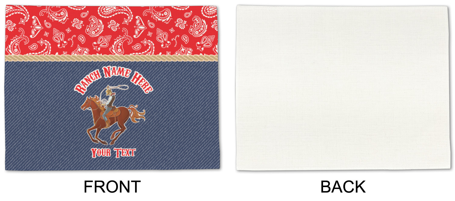 The design has two backgrounds where one fills up two thirds of the background and the other fills up the remaining third. The top third is a bright red paisley design that will get you smiling. The bottom two thirds is a denim pattern that feels like home. A rope ribbon divides the two backgrounds. On the bottom part is a roping cowboy graphic with your personalization above and below him.