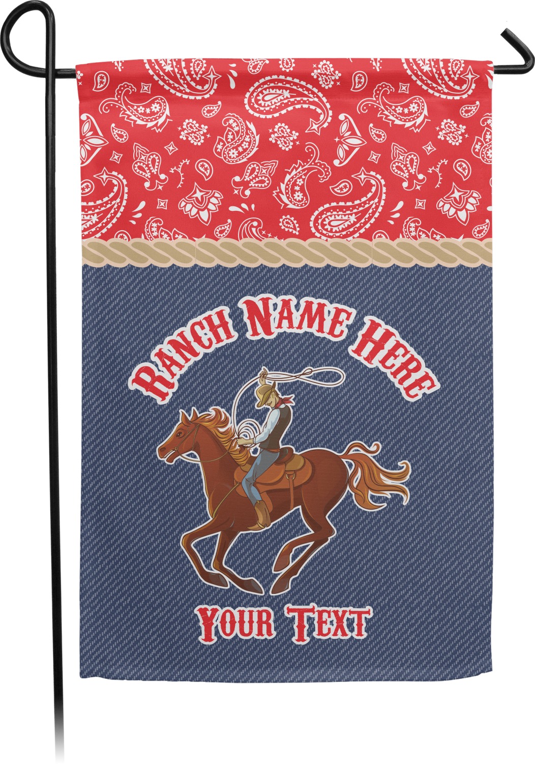 These custom garden flags are made of a durable, double-ply, polyester weave, allowing them to withstand the elements year round. The small flags measure at approximately 12 by 18 inches. The large flags measure out to 28 by 37 inches. You can order these decorative flags with your customization printed on the front only, or the front and back.