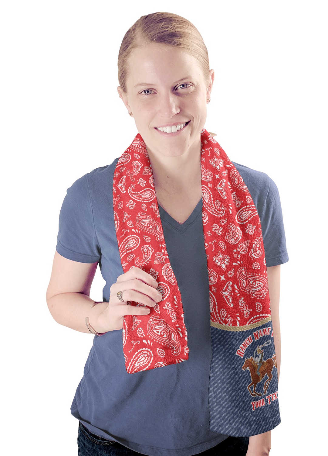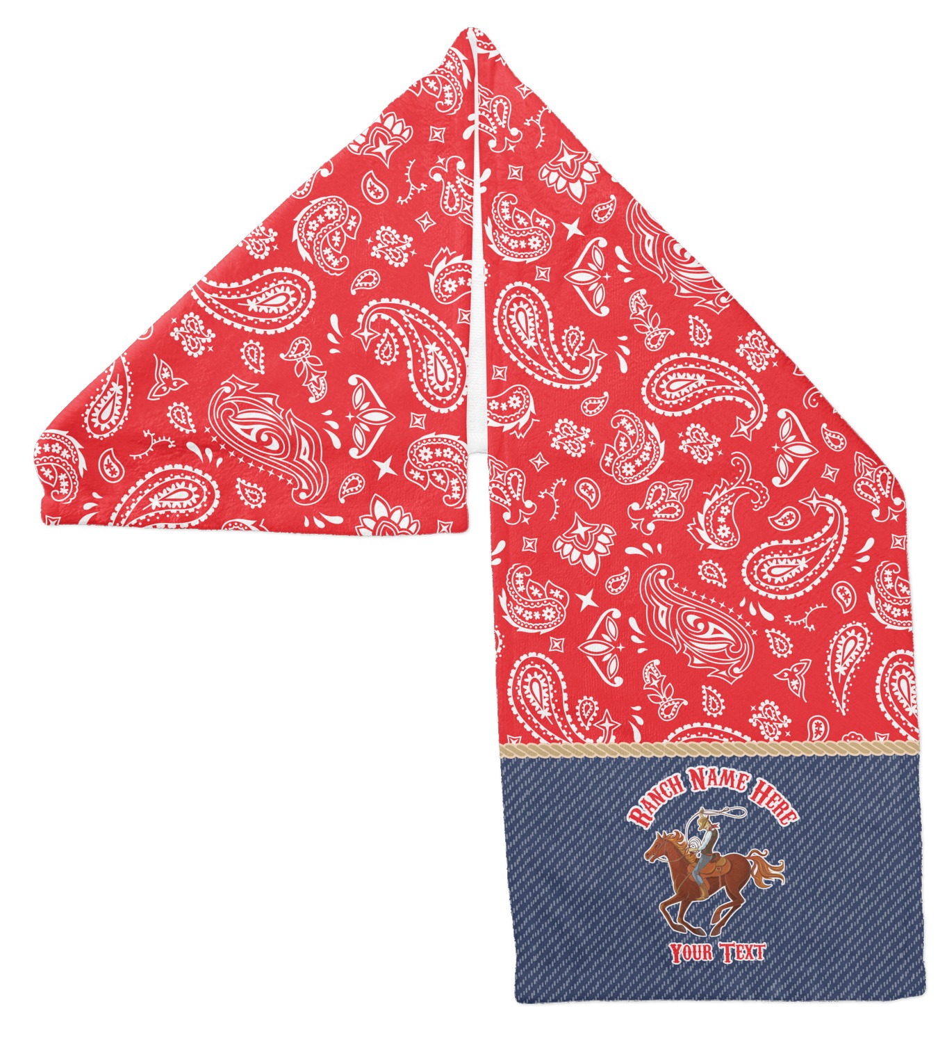 The design has two backgrounds where one fills up two thirds of the background and the other fills up the remaining third. The top third is a bright red paisley design that will get you smiling. The bottom two thirds is a denim pattern that feels like home. A rope ribbon divides the two backgrounds. On the bottom part is a roping cowboy graphic with your personalization above and below him.