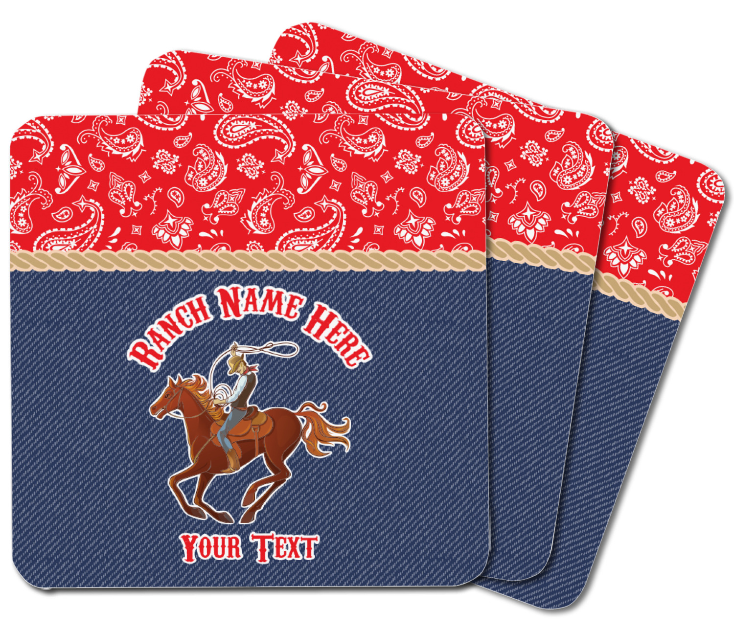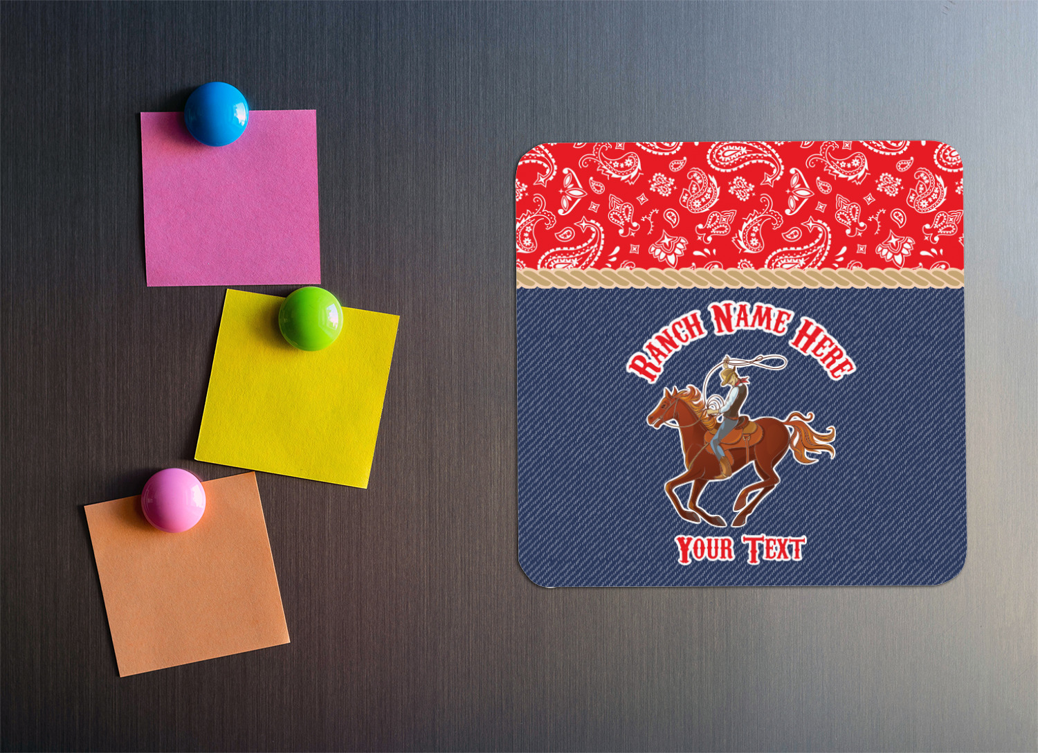 The design has two backgrounds where one fills up two thirds of the background and the other fills up the remaining third. The top third is a bright red paisley design that will get you smiling. The bottom two thirds is a denim pattern that feels like home. A rope ribbon divides the two backgrounds. On the bottom part is a roping cowboy graphic with your personalization above and below him.