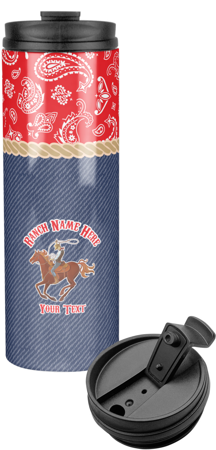 The design has two backgrounds where one fills up two thirds of the background and the other fills up the remaining third. The top third is a bright red paisley design that will get you smiling. The bottom two thirds is a denim pattern that feels like home. A rope ribbon divides the two backgrounds. On the bottom part is a roping cowboy graphic with your personalization above and below him.