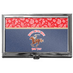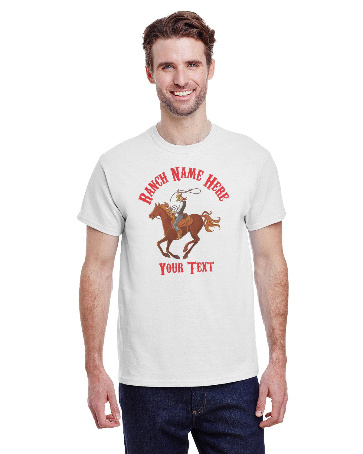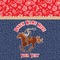 The design has two backgrounds where one fills up two thirds of the background and the other fills up the remaining third. The top third is a bright red paisley design that will get you smiling. The bottom two thirds is a denim pattern that feels like home. A rope ribbon divides the two backgrounds. On the bottom part is a roping cowboy graphic with your personalization above and below him.