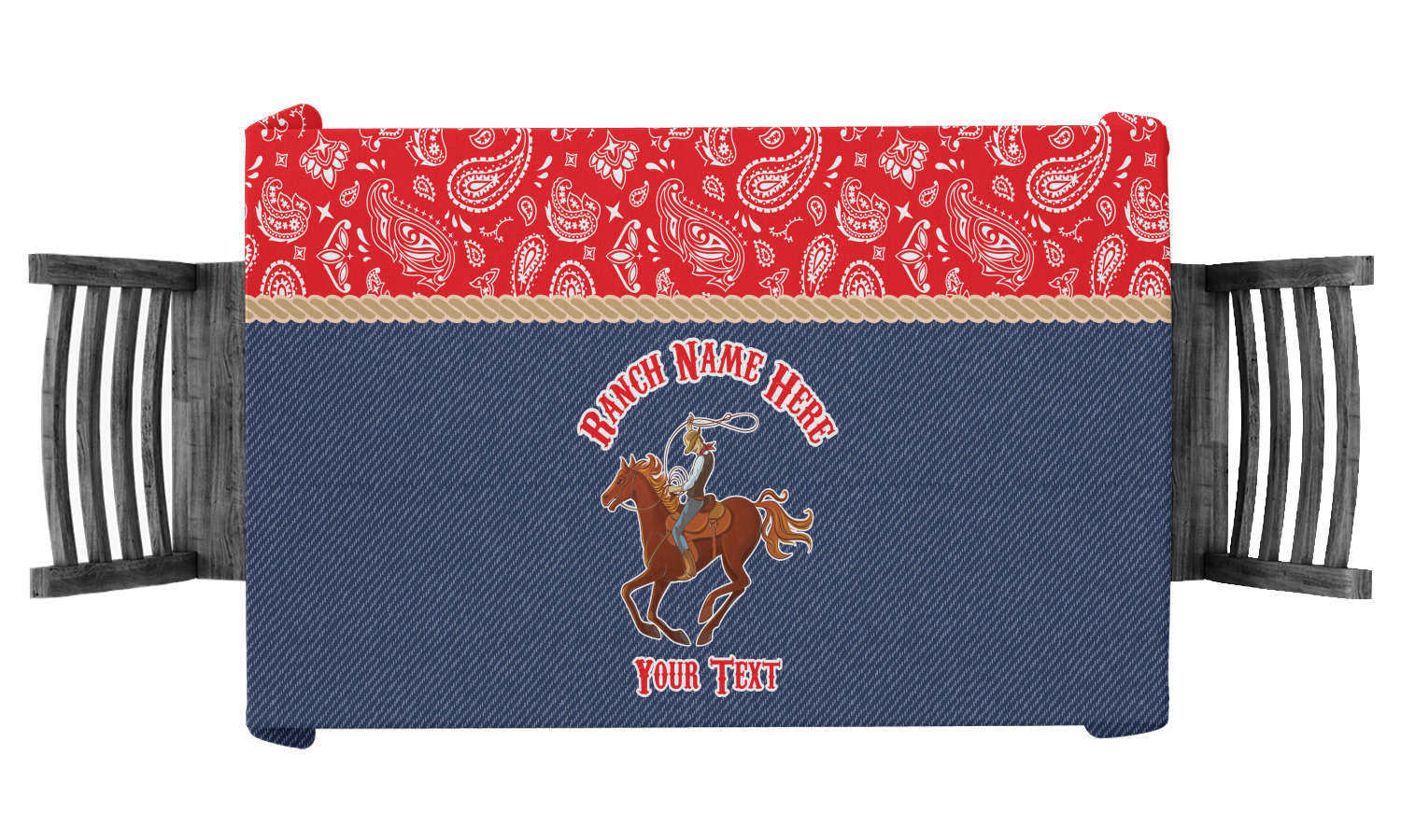 The design has two backgrounds where one fills up two thirds of the background and the other fills up the remaining third. The top third is a bright red paisley design that will get you smiling. The bottom two thirds is a denim pattern that feels like home. A rope ribbon divides the two backgrounds. On the bottom part is a roping cowboy graphic with your personalization above and below him.