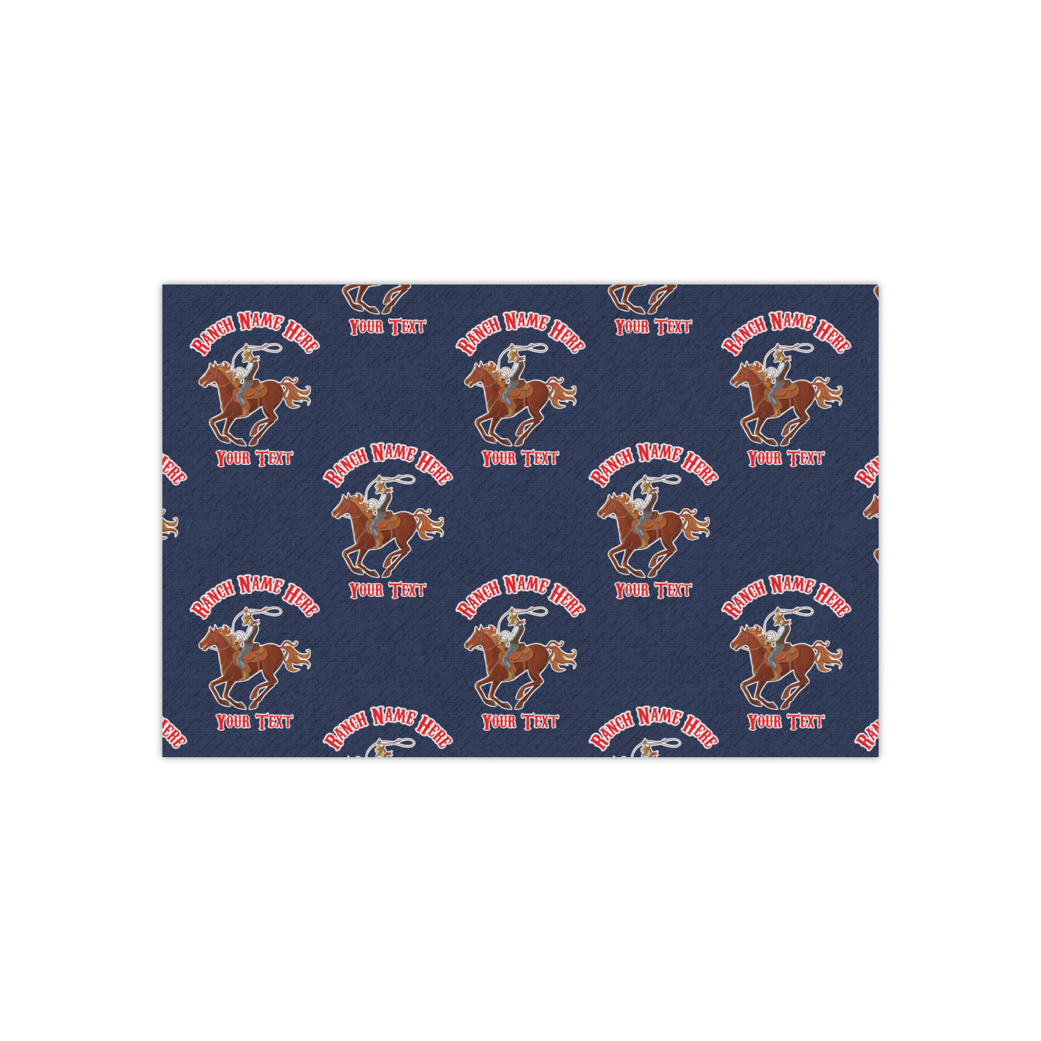 The design has two backgrounds where one fills up two thirds of the background and the other fills up the remaining third. The top third is a bright red paisley design that will get you smiling. The bottom two thirds is a denim pattern that feels like home. A rope ribbon divides the two backgrounds. On the bottom part is a roping cowboy graphic with your personalization above and below him.