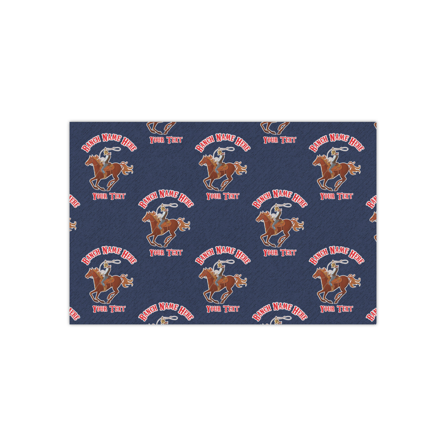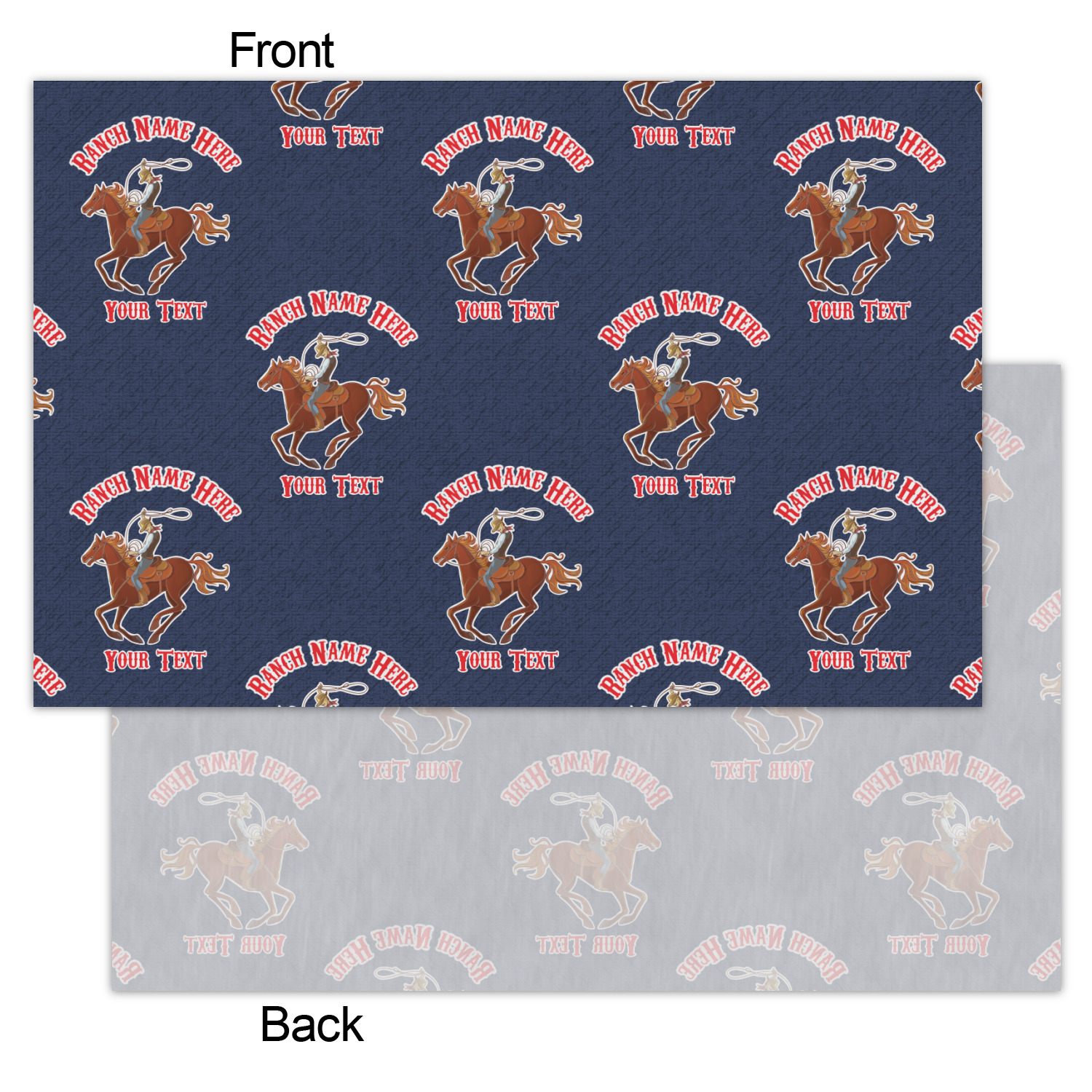 The design has two backgrounds where one fills up two thirds of the background and the other fills up the remaining third. The top third is a bright red paisley design that will get you smiling. The bottom two thirds is a denim pattern that feels like home. A rope ribbon divides the two backgrounds. On the bottom part is a roping cowboy graphic with your personalization above and below him.