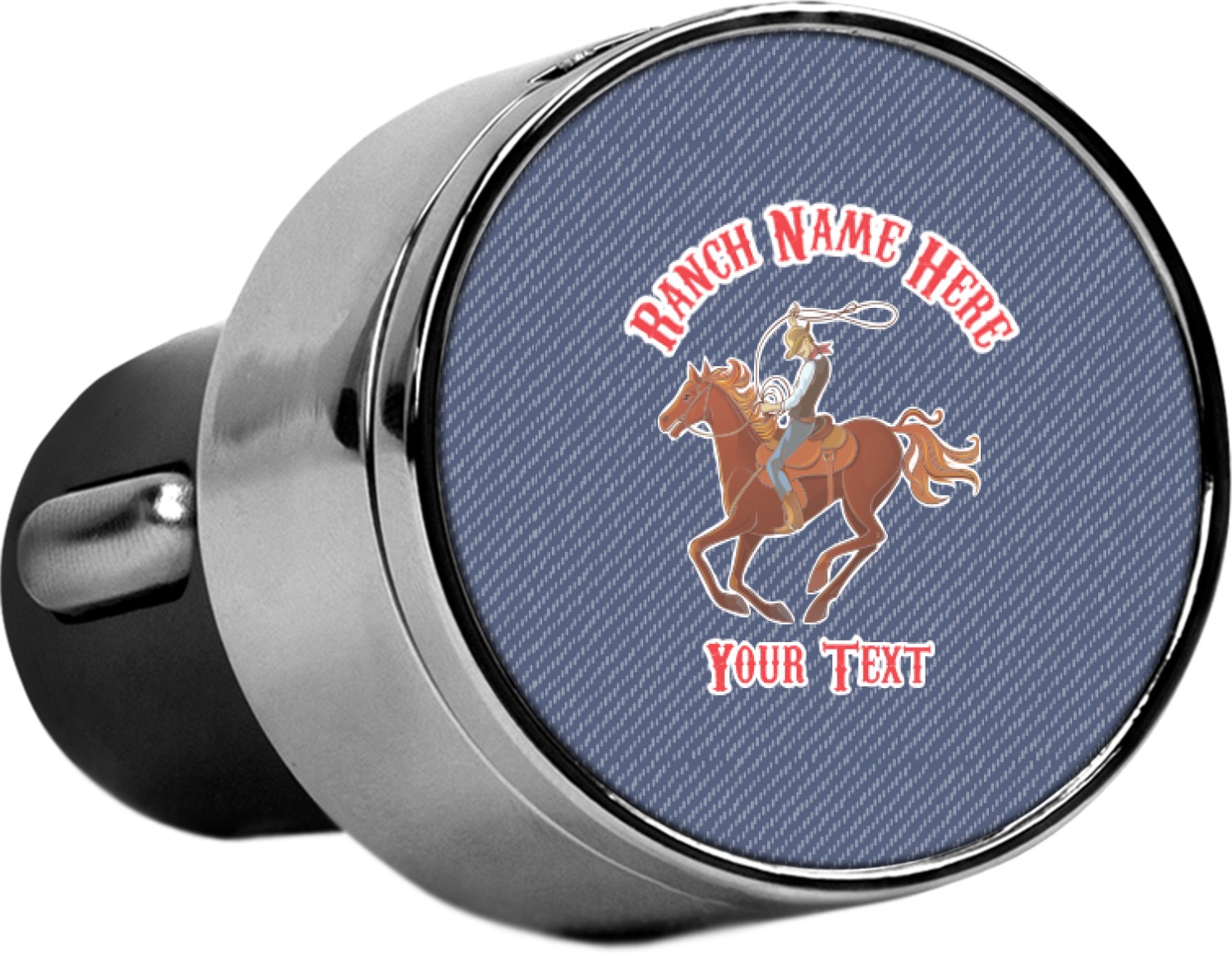 This car charger adapter converts your cars bland cigarette lighter into a decorative, personalized, and operational USB charging port. Made of solid, silver-plated metal, these chargers feature a flip-open lid that both displays your customized design and conceals two USB ports. The metal lid of the USB car charger adapter is 1.5" in diameter and seals due to a small, ingrained magnet on both the charger and its lid. The cigarette lighter insert, itself, is colored black.