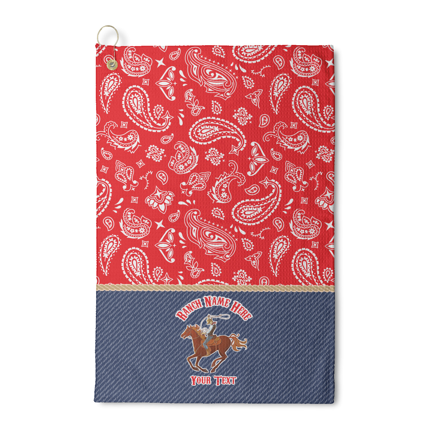 The design has two backgrounds where one fills up two thirds of the background and the other fills up the remaining third. The top third is a bright red paisley design that will get you smiling. The bottom two thirds is a denim pattern that feels like home. A rope ribbon divides the two backgrounds. On the bottom part is a roping cowboy graphic with your personalization above and below him.