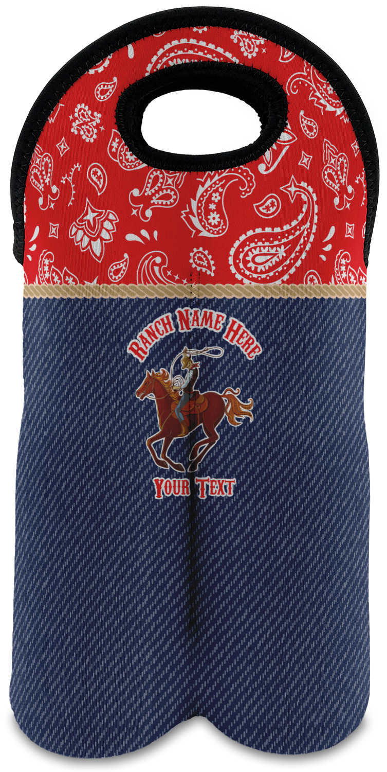 The design has two backgrounds where one fills up two thirds of the background and the other fills up the remaining third. The top third is a bright red paisley design that will get you smiling. The bottom two thirds is a denim pattern that feels like home. A rope ribbon divides the two backgrounds. On the bottom part is a roping cowboy graphic with your personalization above and below him.