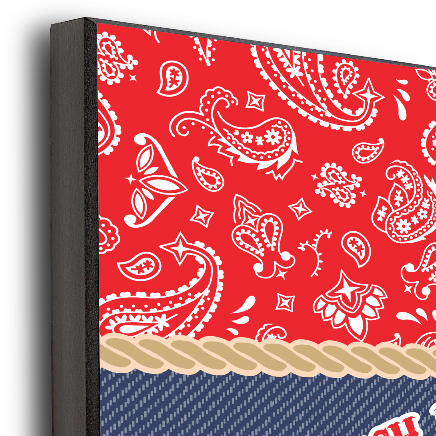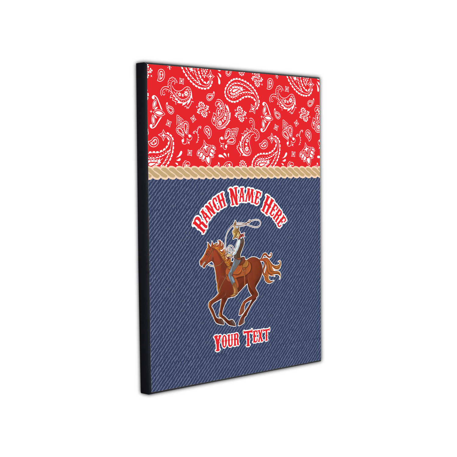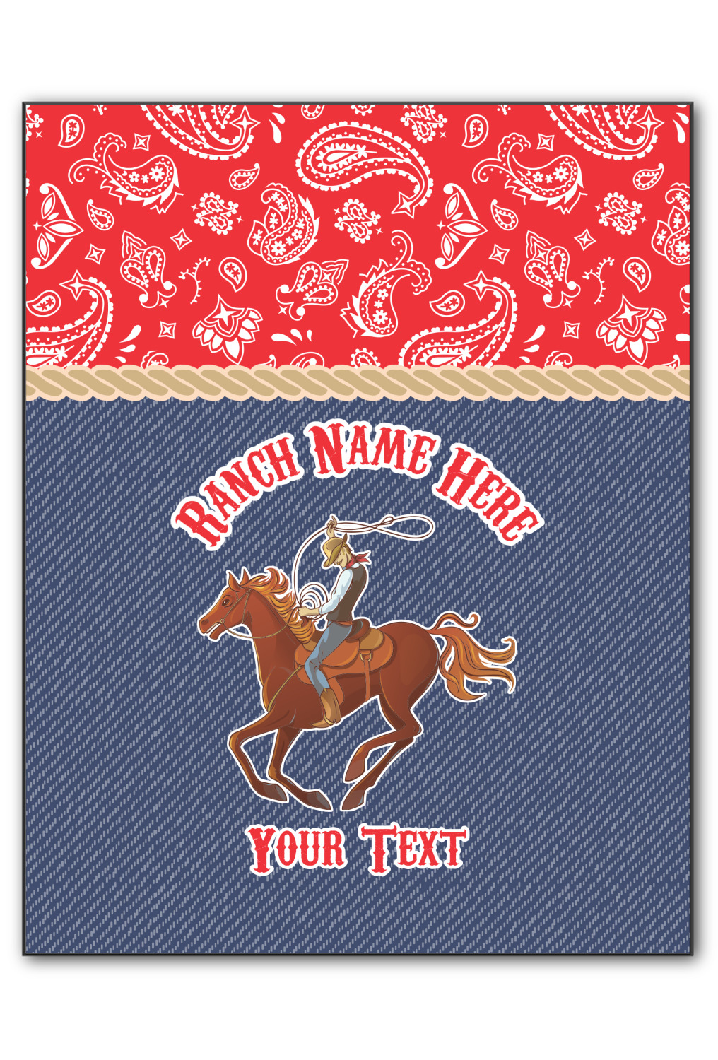 The design has two backgrounds where one fills up two thirds of the background and the other fills up the remaining third. The top third is a bright red paisley design that will get you smiling. The bottom two thirds is a denim pattern that feels like home. A rope ribbon divides the two backgrounds. On the bottom part is a roping cowboy graphic with your personalization above and below him.