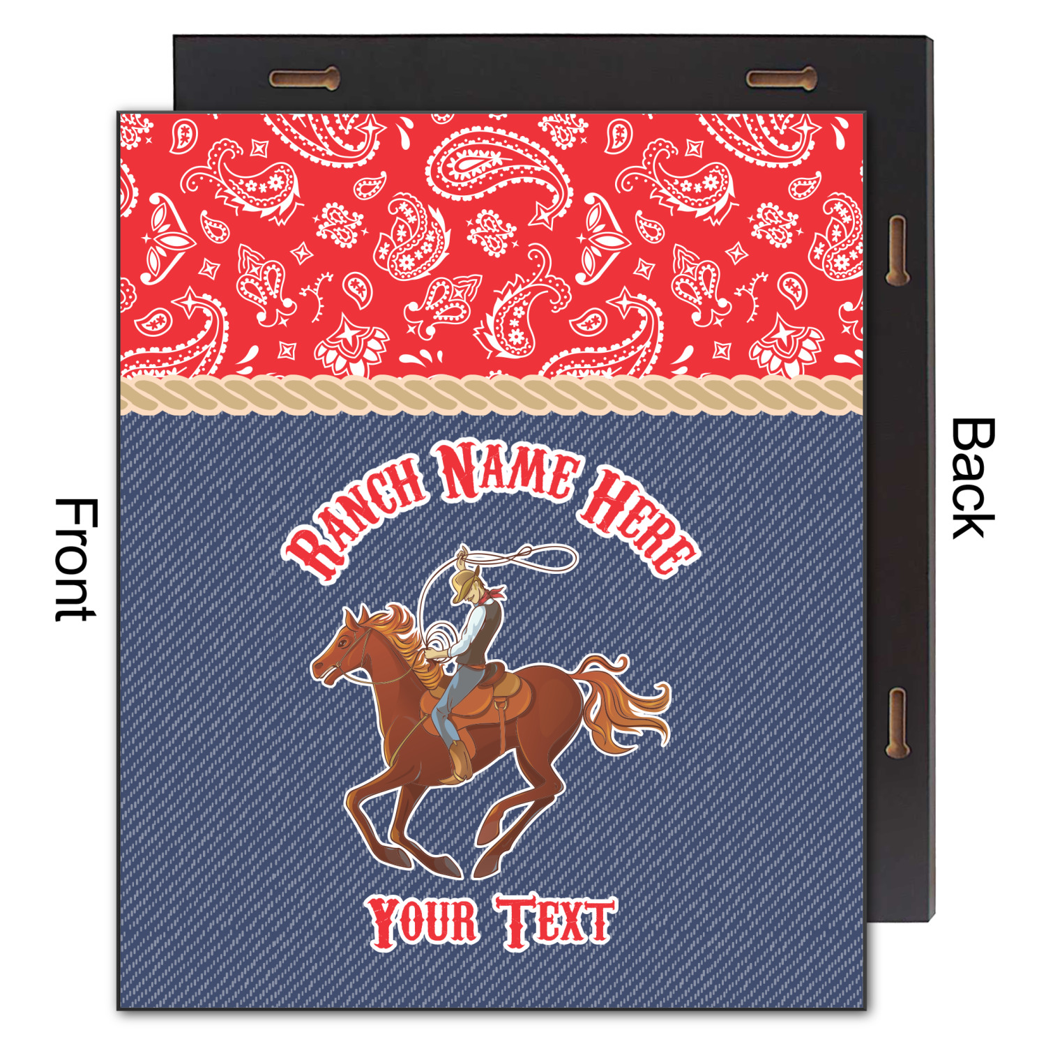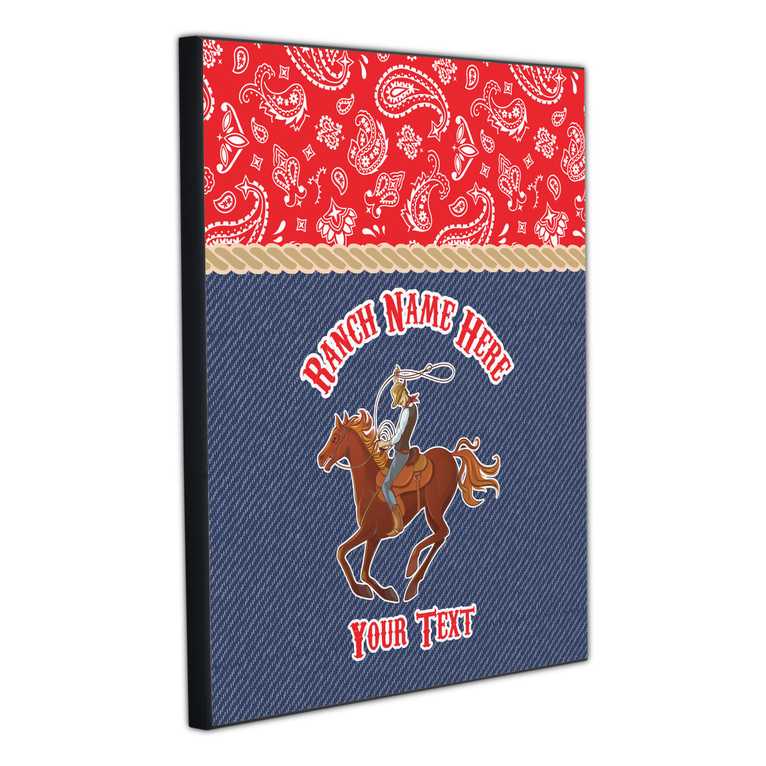 The design has two backgrounds where one fills up two thirds of the background and the other fills up the remaining third. The top third is a bright red paisley design that will get you smiling. The bottom two thirds is a denim pattern that feels like home. A rope ribbon divides the two backgrounds. On the bottom part is a roping cowboy graphic with your personalization above and below him.