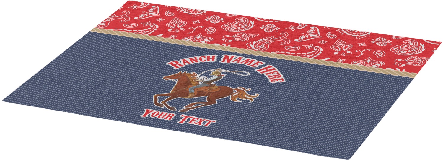 The design has two backgrounds where one fills up two thirds of the background and the other fills up the remaining third. The top third is a bright red paisley design that will get you smiling. The bottom two thirds is a denim pattern that feels like home. A rope ribbon divides the two backgrounds. On the bottom part is a roping cowboy graphic with your personalization above and below him.
