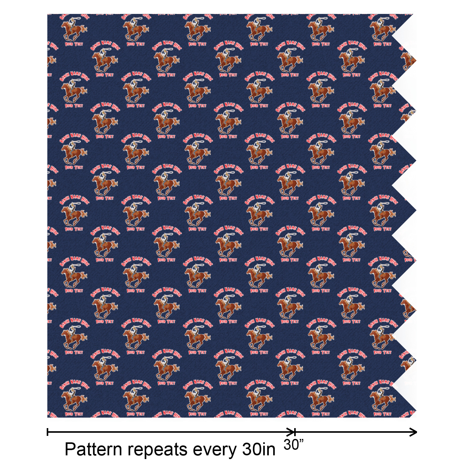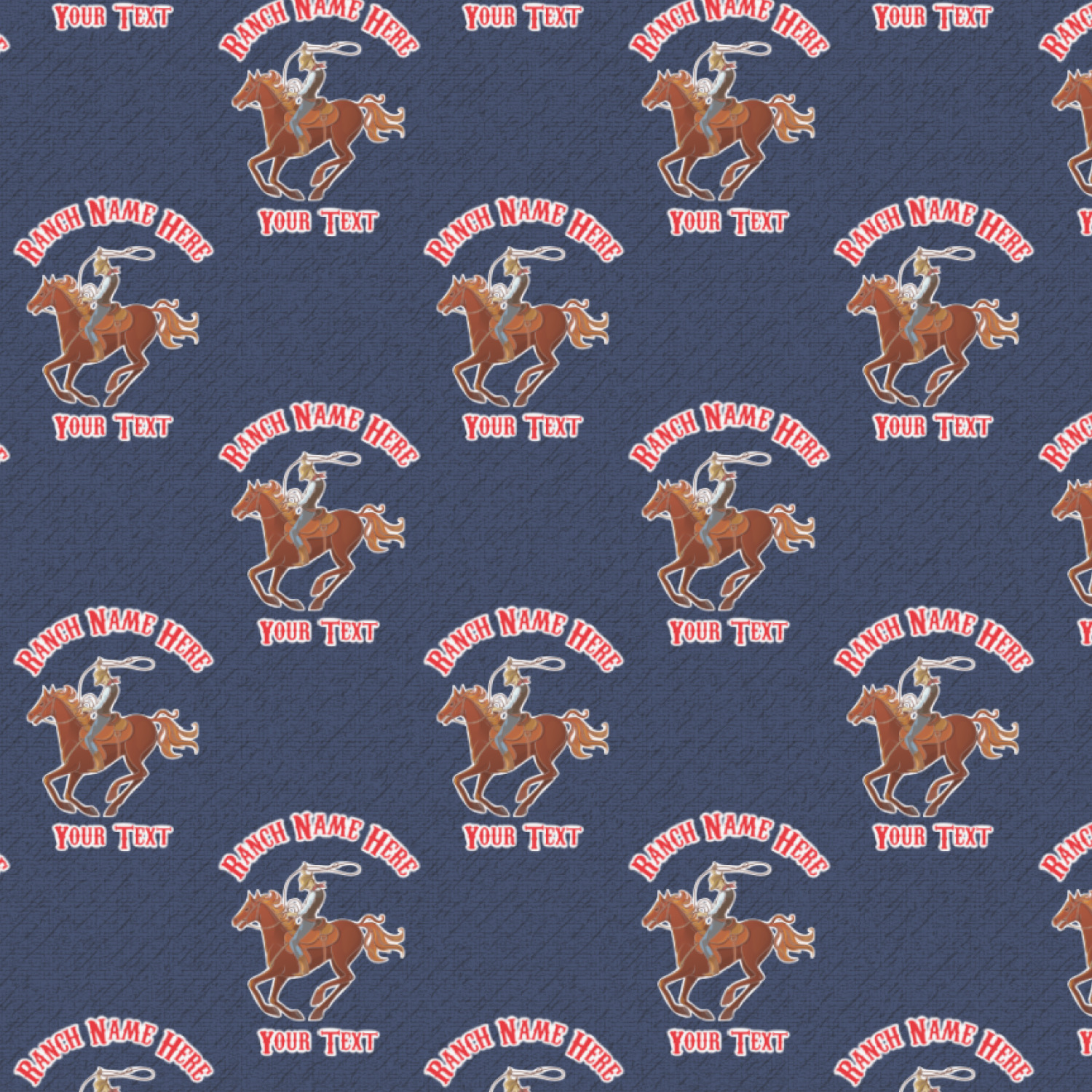 The design has two backgrounds where one fills up two thirds of the background and the other fills up the remaining third. The top third is a bright red paisley design that will get you smiling. The bottom two thirds is a denim pattern that feels like home. A rope ribbon divides the two backgrounds. On the bottom part is a roping cowboy graphic with your personalization above and below him.