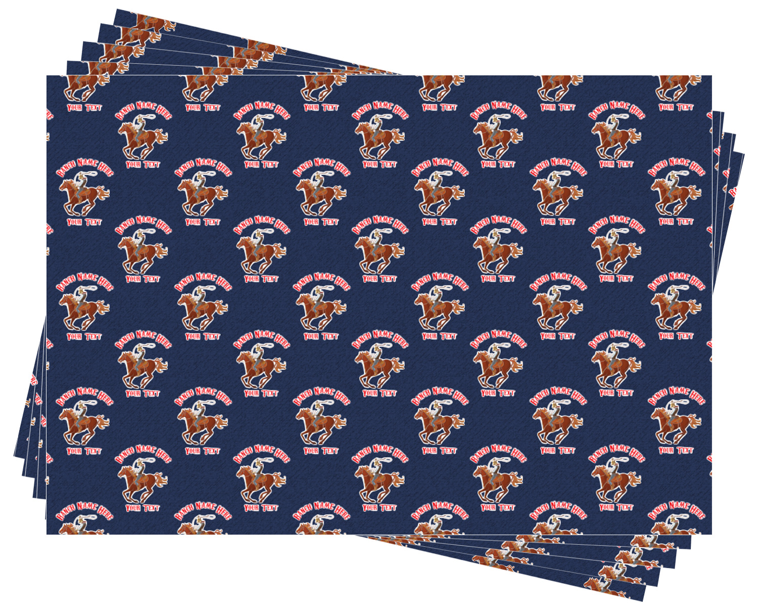 The design has two backgrounds where one fills up two thirds of the background and the other fills up the remaining third. The top third is a bright red paisley design that will get you smiling. The bottom two thirds is a denim pattern that feels like home. A rope ribbon divides the two backgrounds. On the bottom part is a roping cowboy graphic with your personalization above and below him.