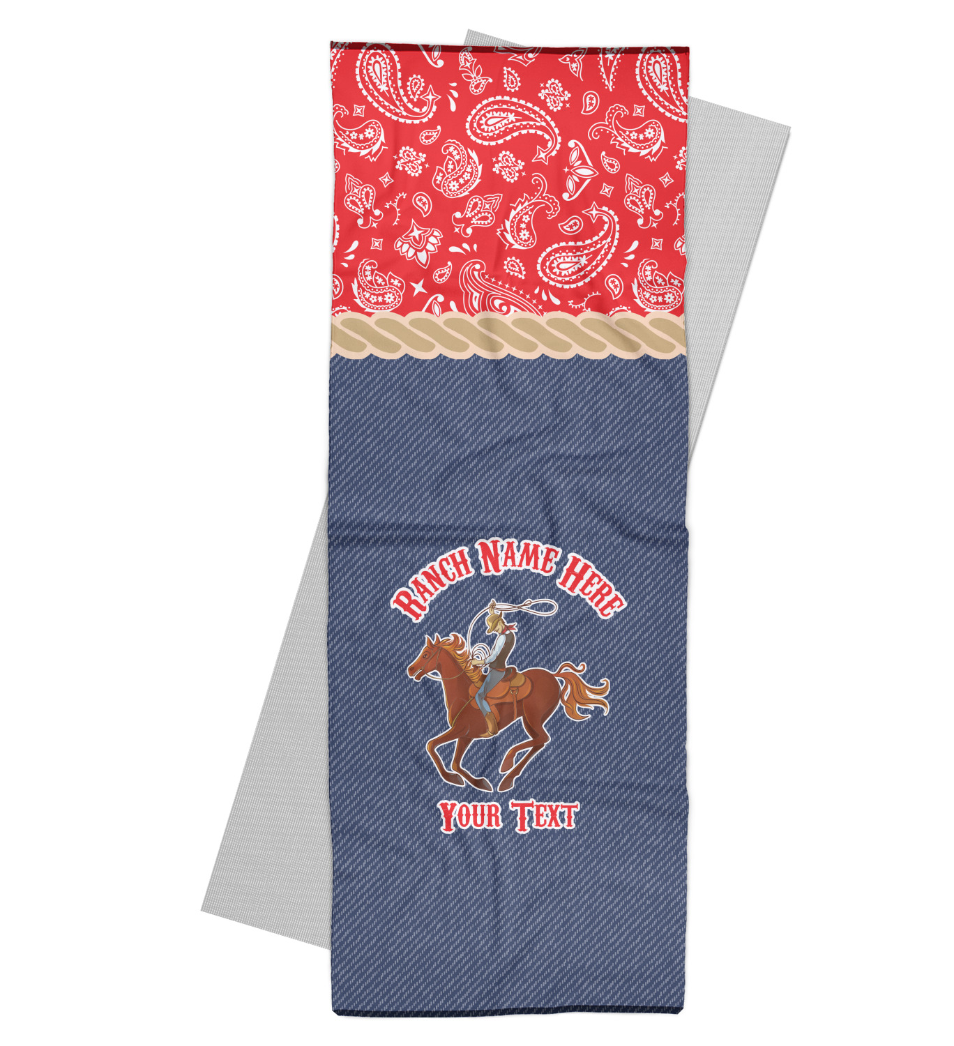 The design has two backgrounds where one fills up two thirds of the background and the other fills up the remaining third. The top third is a bright red paisley design that will get you smiling. The bottom two thirds is a denim pattern that feels like home. A rope ribbon divides the two backgrounds. On the bottom part is a roping cowboy graphic with your personalization above and below him.