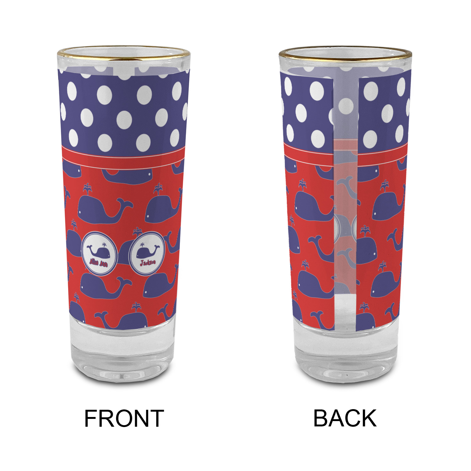 These glass shooter glasses are printed in full color with the design of your choice. These are a tall shooter 2 oz size and stand 4" tall. The print is a full wrap design to boldly display your personalization.