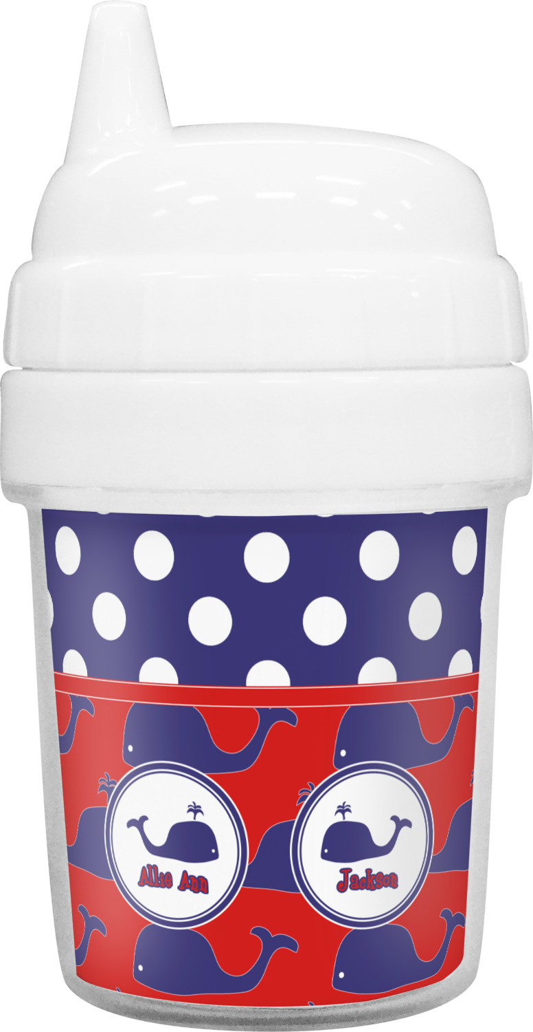 Our toddler cups are free of BPA, and have a twist-open lid so that you can easily fill and clean these cups for your young ones. Each cup also comes with a sippy nozzle to reduce spills. We offer these custom sippy cups in two different sizes; we have a baby sippy cup that holds 5 ounces, and a toddler sippy cup that holds 10 ounces. Your customization is printed on a premium glossy media insert that is placed within these toddler drinking cups.