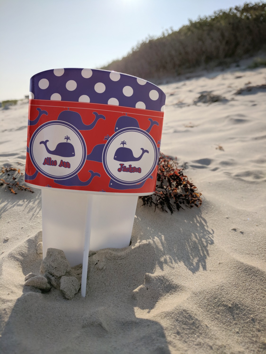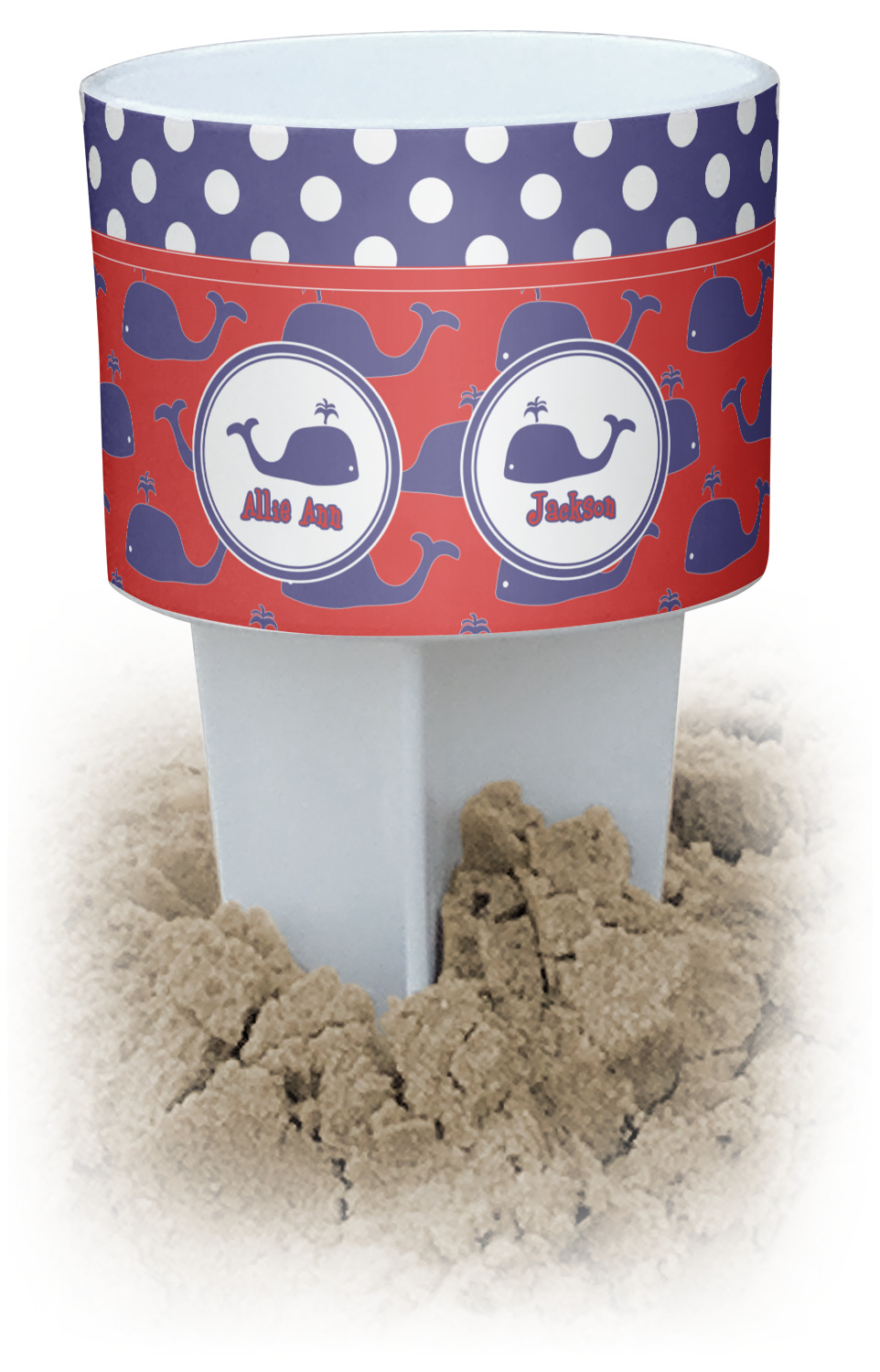 This cup holder has a large stake at its bottom that anchors it to the sand or ground below, while the cup holder rests above the stake. The entire drink holder is made of durable plastic and displays your customization around the cup holder portion. We sell these personalized beach spikers in two different colors: black and white.