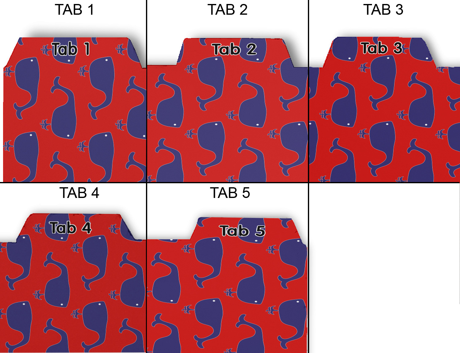 Whether you use binders at school or at work, we have designs to suit all of them. Available in 5 or 6 tab sets, you are sure to find a set to suit your needs. The back of each one is white and can be used to take notes, write vital information on, etc.