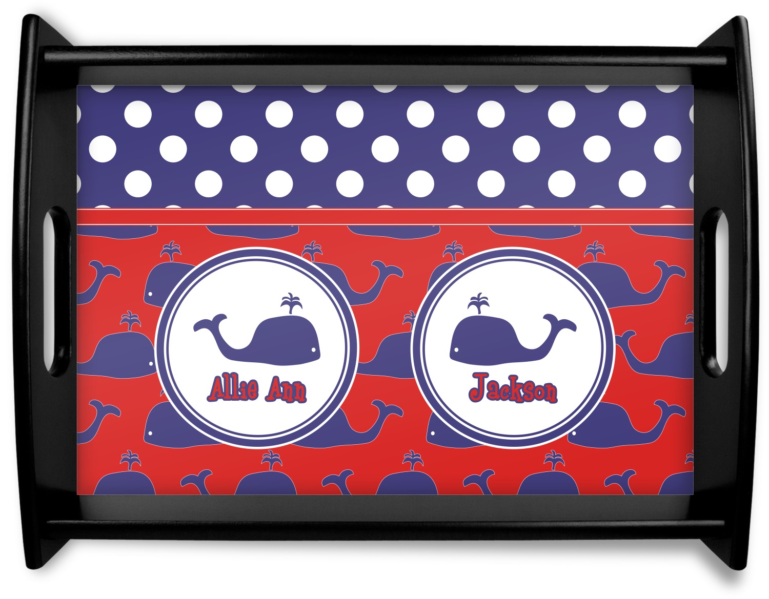 This serving tray with handles features square edges and two rounded sides, creating a very modern look. Each side is fabricated from a beautifully cut, natural wood. The bottom of the interior of the tray displays your customized design in bright, vibrant color. The tray is sold in both a black color and a natural wood look. Each variation of the wood serving tray has two sizes: Small, which is 14" x 10" x 2.25", and Large, which is 19.5" x 13.5" x 2.75".