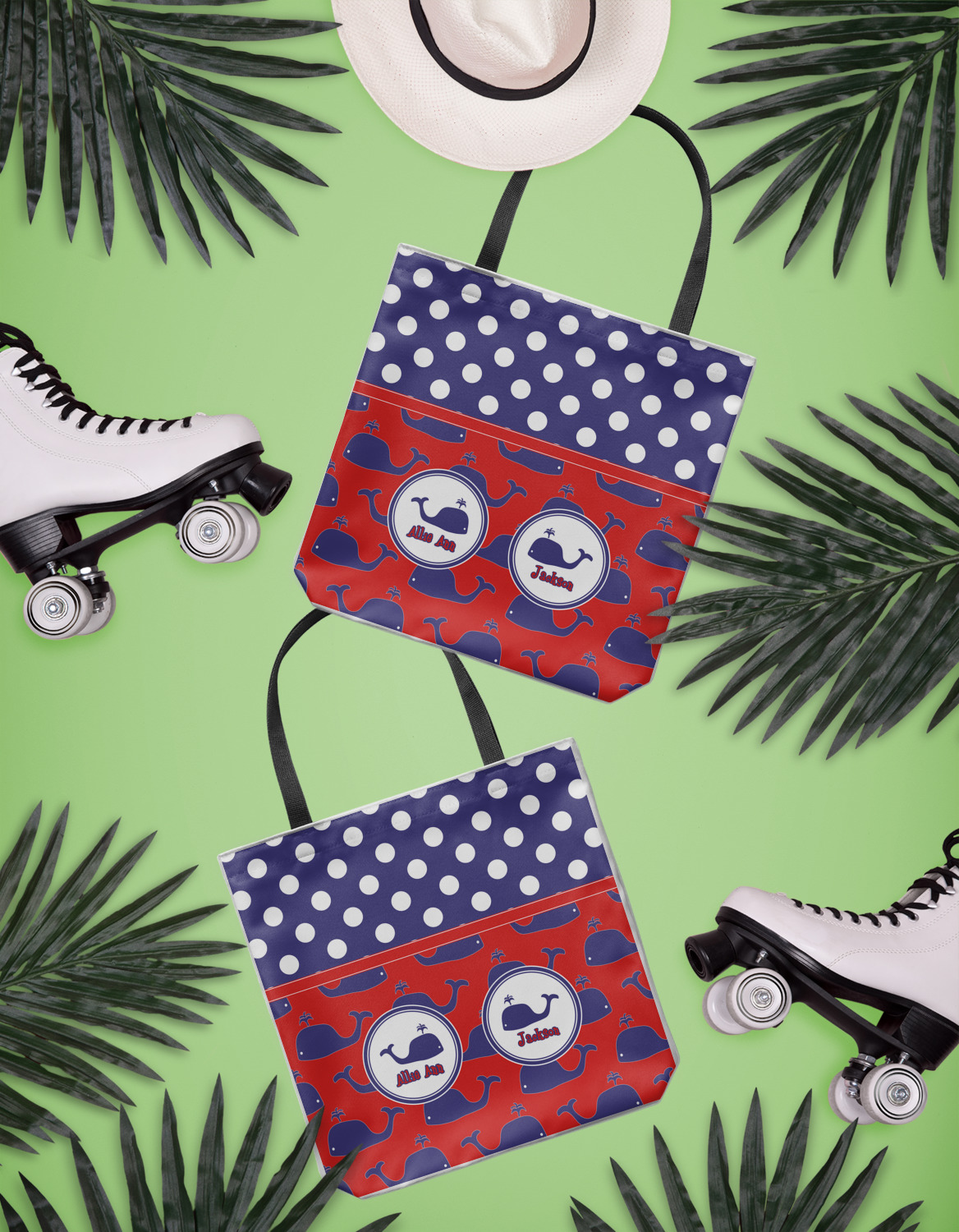 Calling all children who would rather be at the beach than at school! This nautical design, featuring polka dots and whales in All-American classic red, white, and blue, is perfect for you.