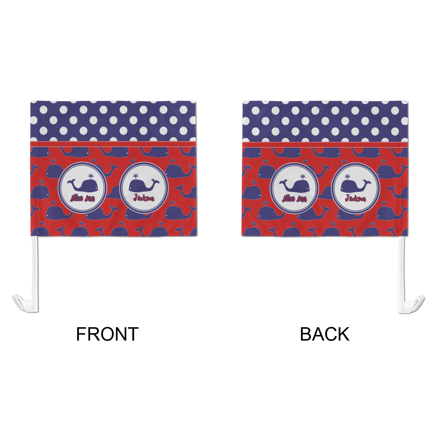 Our personalized flags are made from a durable, yet lightweight cloth that will proudly bear your logo or design of choice, while withstanding the outside elements. We have two size options - 8" x 11" and 11" x 15". Both come with a flag pole which includes a clip that secures the pole to the side window, whether it is rolled up or down. The flags are printed on both sides to display your design from all directions.