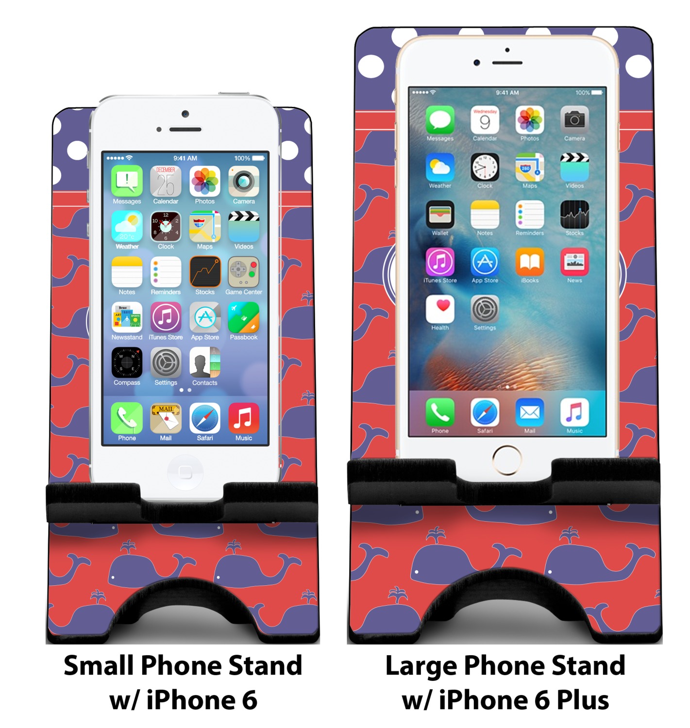 To meet your needs, we offer four variations of this IPhone stand. The backboard of the first version is shaped as a plain, yet sleek rectangle, and is available in two sizes. Our smaller size is approximately 4 by 3.25 by 7 inches, while the larger model is 4 by 3.77 by 8.5 inches. Alongside this model, we also provide you with a more decorative option. The upper part of our second version features a curved edge, for a classy, suave appearance. This phone holder is also sold in two sizes: a smaller version, which is 4 by 3.25 by 7 inches, and our larger model, which is 4 by 3.77 by 8.5 inches. Both models will support large phones, but the larger model is better if you wish to proudly display your personalized design.